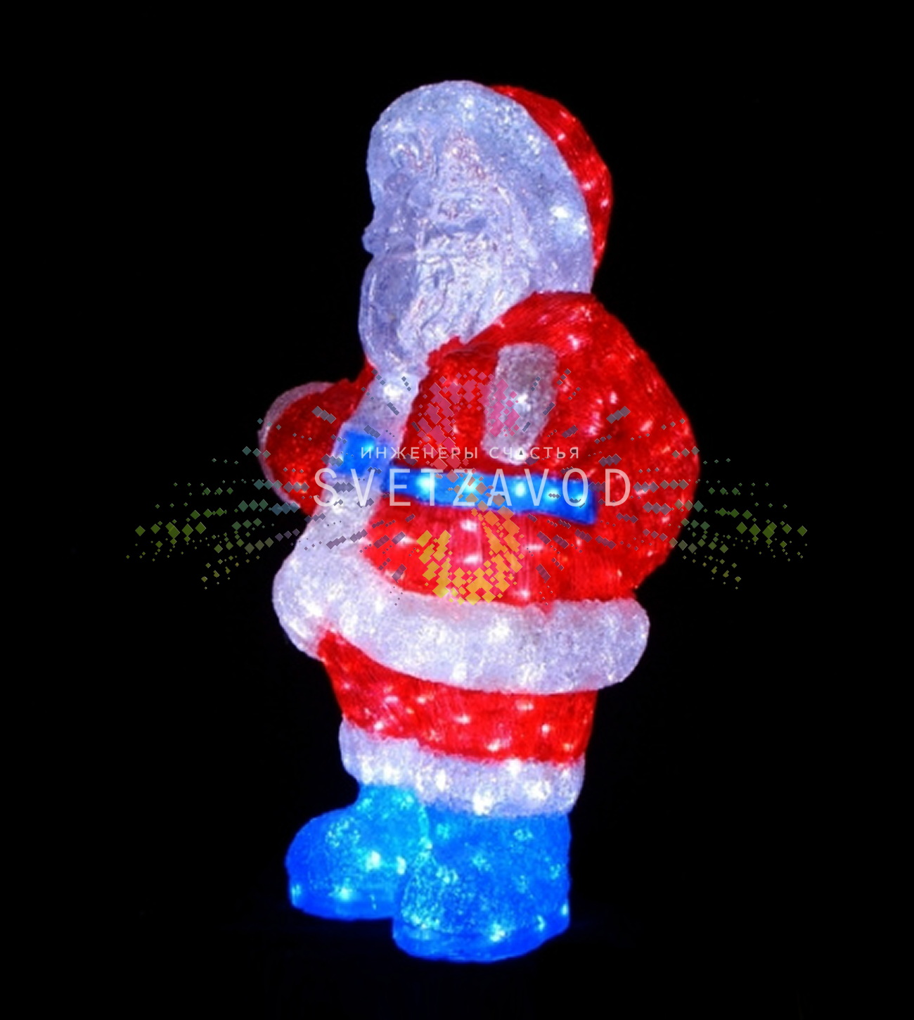 Светодиодная фигура Дед Мороз – это объемная фигура из акрила размером 66 см, количество светодиодов - 408 штук, 24В, защита от влаги и пыли по ГОСТ 14254-96 - IP65 обеспечивает защиту от осадков, её можно эксплуатировать на улице. Работает в режиме постоянного свечения, блок питания с понижающим трансформатором 24В в комплекте.