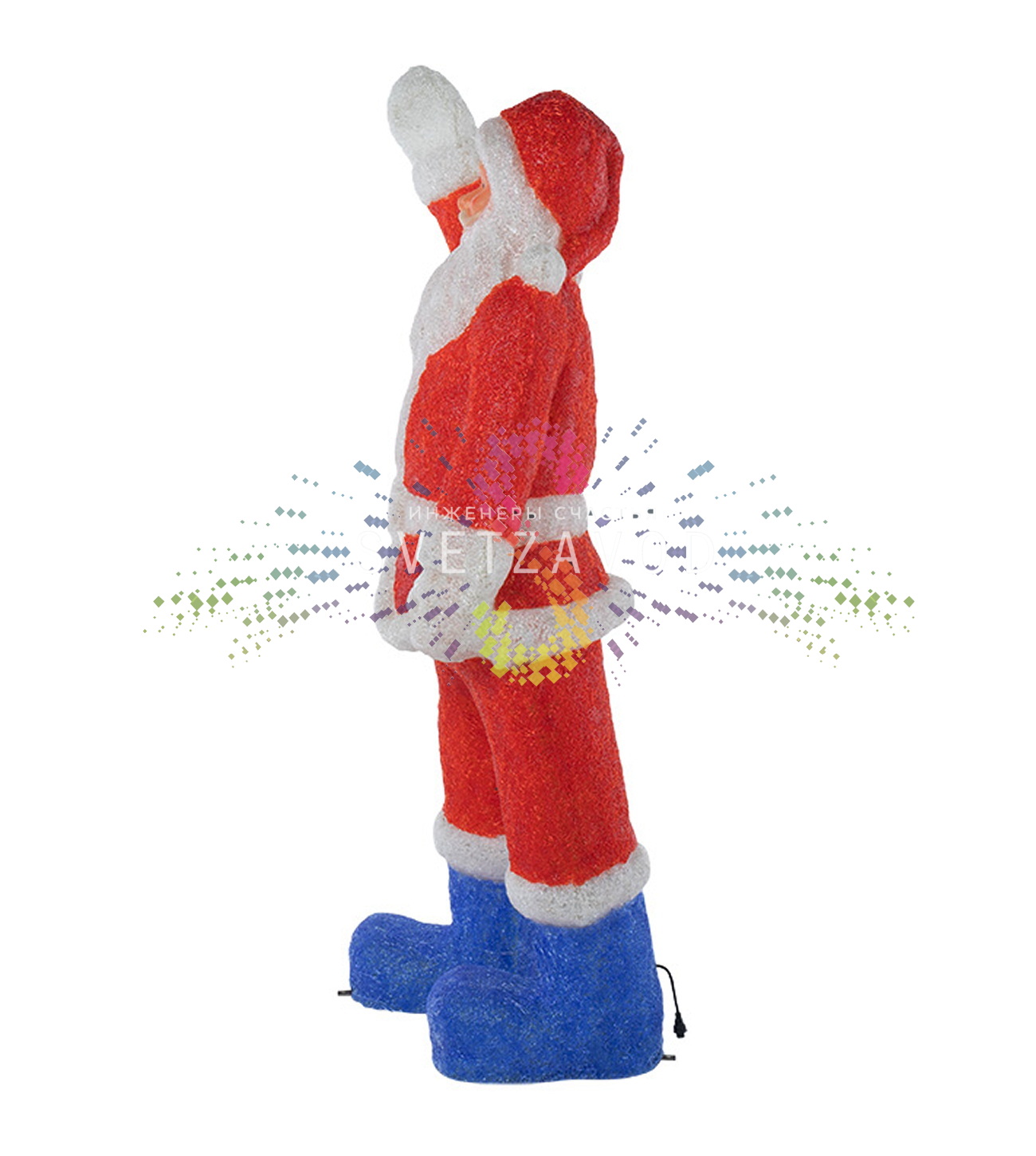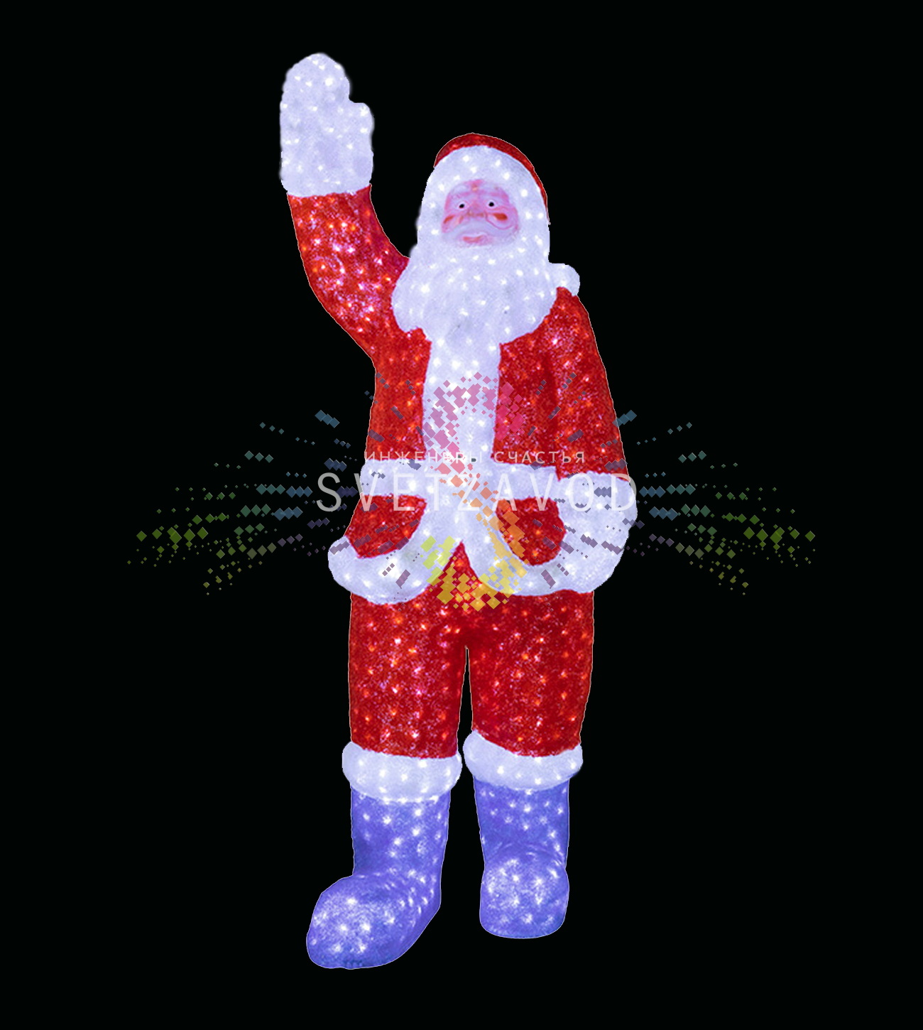 Светодиодная фигура Санта Клаус – это объемная фигура из акрила размером 210х75х60 см, количество светодиодов - 4400 штук, 24В, защита от влаги и пыли по ГОСТ 14254-96 - IP65 обеспечивает защиту от осадков, её можно эксплуатировать на улице. Работает в режиме постоянного свечения, блок питания с понижающим трансформатором 24В в комплекте.