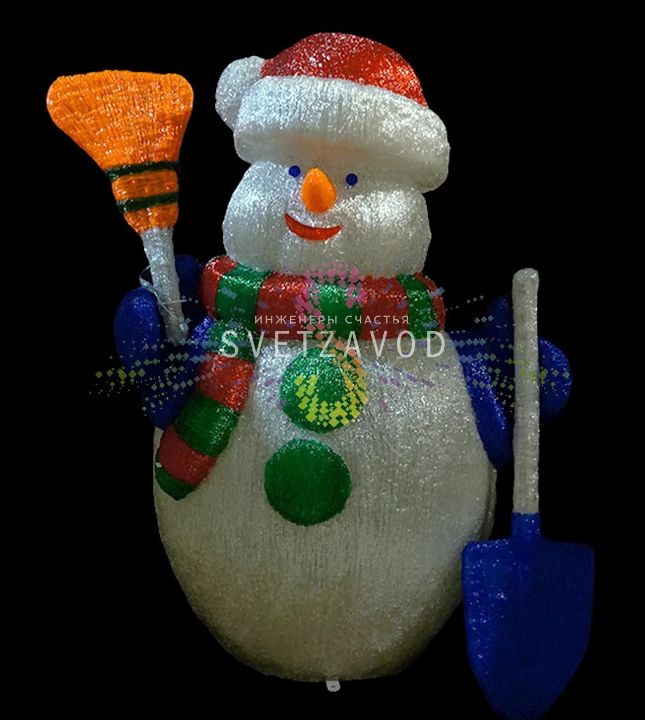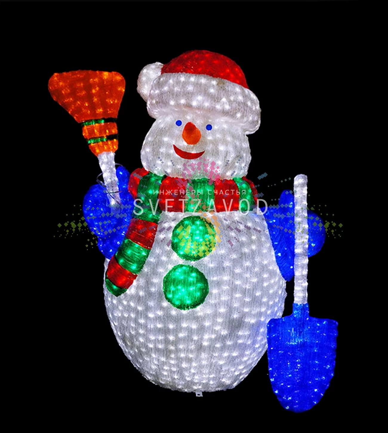 Яркое и безопасное решение: Акриловая фигура 3D Снеговик с лопатой и метлой — это готовый элемент новогоднего декора, который работает от безопасного низкого напряжения 24В. Благодаря 2000 светодиодов и технологии фиксинг, фигура создает яркое, равномерное свечение, заметное даже днем. Защита IP65 позволяет использовать ее как для уличного оформления, так и в интерьере, не беспокоясь о дожде или снеге.