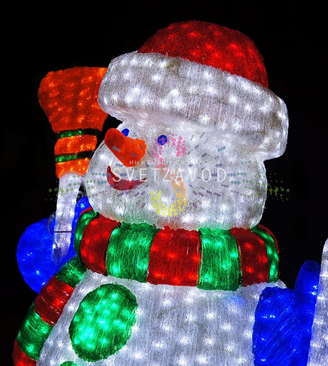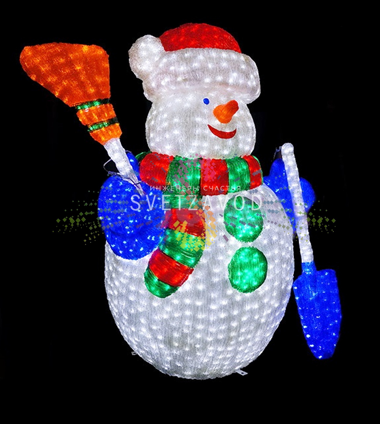 Светодиодная фигура Снеговик с лопатой и метлой – это объемная фигура из акрила размером 120 см, количество светодиодов - 2000 штук, 24В, защита от влаги и пыли по ГОСТ 14254-96 - IP65 обеспечивает защиту от осадков, её можно эксплуатировать на улице. Работает в режиме постоянного свечения, блок питания с понижающим трансформатором 24В в комплекте.