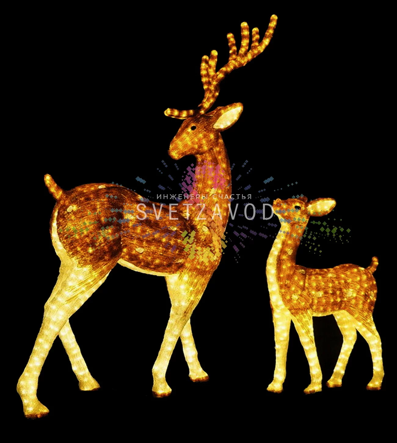 В комплекте две объемные фигуры коричневых оленей высотой 200 и 100 см. Они изготовлены из прочного акрила с внутренней LED-подсветкой, работают от безопасного напряжения 24В и предназначены для использования как в интерьере, так и на улице. Все необходимое для монтажа уже в коробке.