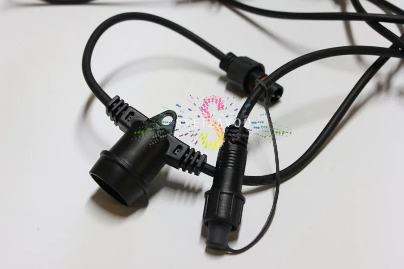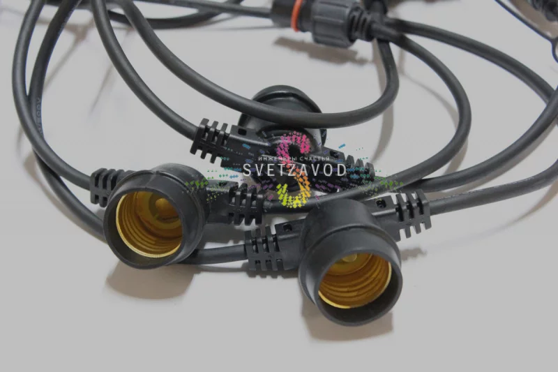 Прочная основа: Двухжильный медный провод в черной каучуковой оболочке — это сердце гирлянды. Каучук сохраняет гибкость в широком температурном диапазоне, не трескается на морозе и защищает от ультрафиолета. Патроны E27 оснащены фиксирующими элементами, которые надежно удерживают лампу, предотвращая ее выпадение от вибрации или ветра.