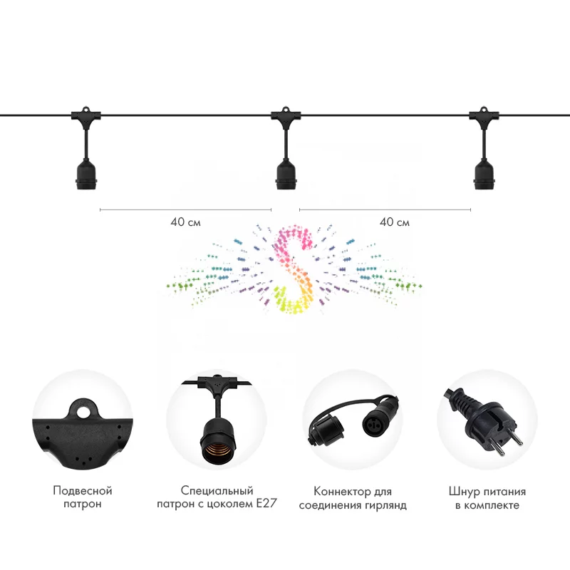Черный каучуковый кабель и степень защиты IP65 делают эту гирлянду из лампочек уличной по-настоящему всесезонной. Параллельная схема подключения гарантирует, что при выходе из строя одной лампы вся цепь продолжит работать, что критически важно для коммерческого использования.