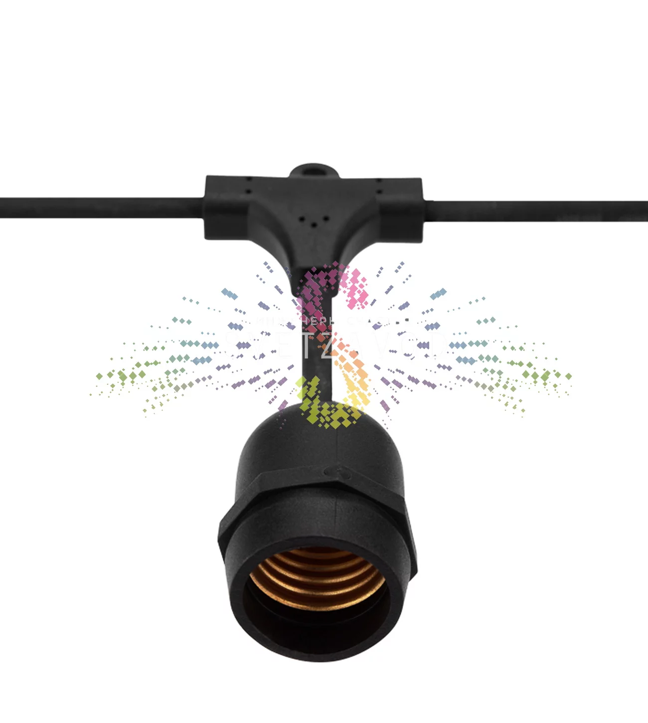 Влагозащищенные патроны E27 и герметичные вводы обеспечивают класс защиты IP65, что позволяет мыть гирлянду под слабым напором воды. Это делает её идеальной для постоянного монтажа на улице.