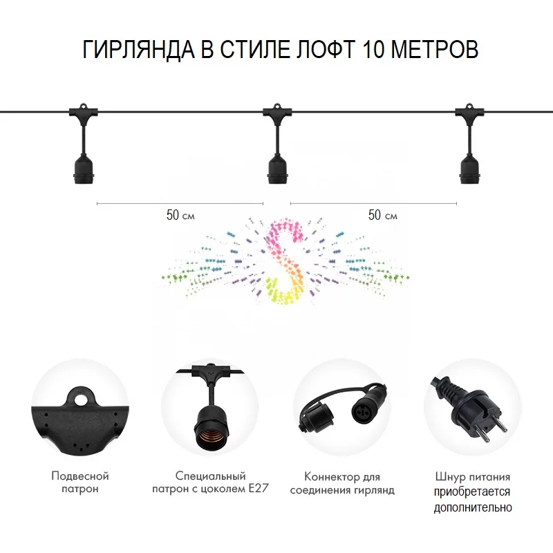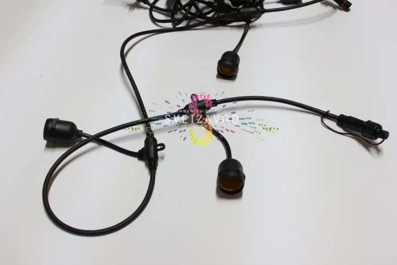 Эта уличная гирлянда с патронами E27 выполнена на черном каучуковом кабеле длиной 10 метров с шагом установки патронов 50 см. Параллельная схема подключения гарантирует, что при перегорании одной лампы остальные продолжают работать.