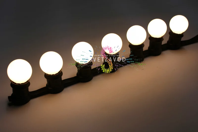 Совет эксперта: Главное преимущество Белт Лайт — возможность кастомизации с помощью различных типов ламп Е27. Для создания теплой, уютной атмосферы в ретро-стиле идеально подходят прозрачные филаментные лампы, имитирующие старинные лампы накаливания. Матовые лампы, подобные вашей (Ø45мм, теплая белая), дают мягкий, рассеянный свет без резких бликов, что идеально для создания спокойной атмосферы в кафе, ресторанах или на террасах. При монтаже длинных пролетов (более 10-15 метров) гирлянду необходимо подвешивать на несущий стальной трос для снятия весовой и ветровой нагрузки.