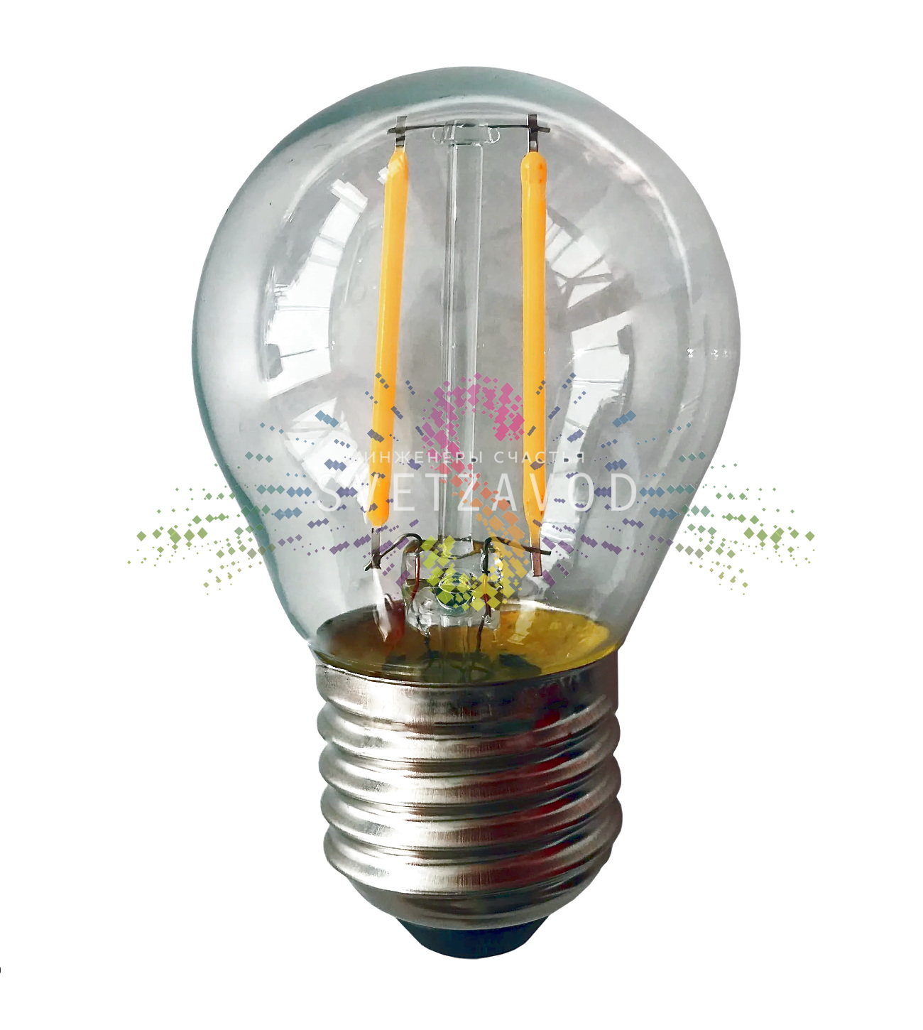 Лампа имеет компактные размеры (диаметр 45 мм) и выполнена в прозрачной стеклянной колбе, что подчеркивает ее ретро-дизайн.