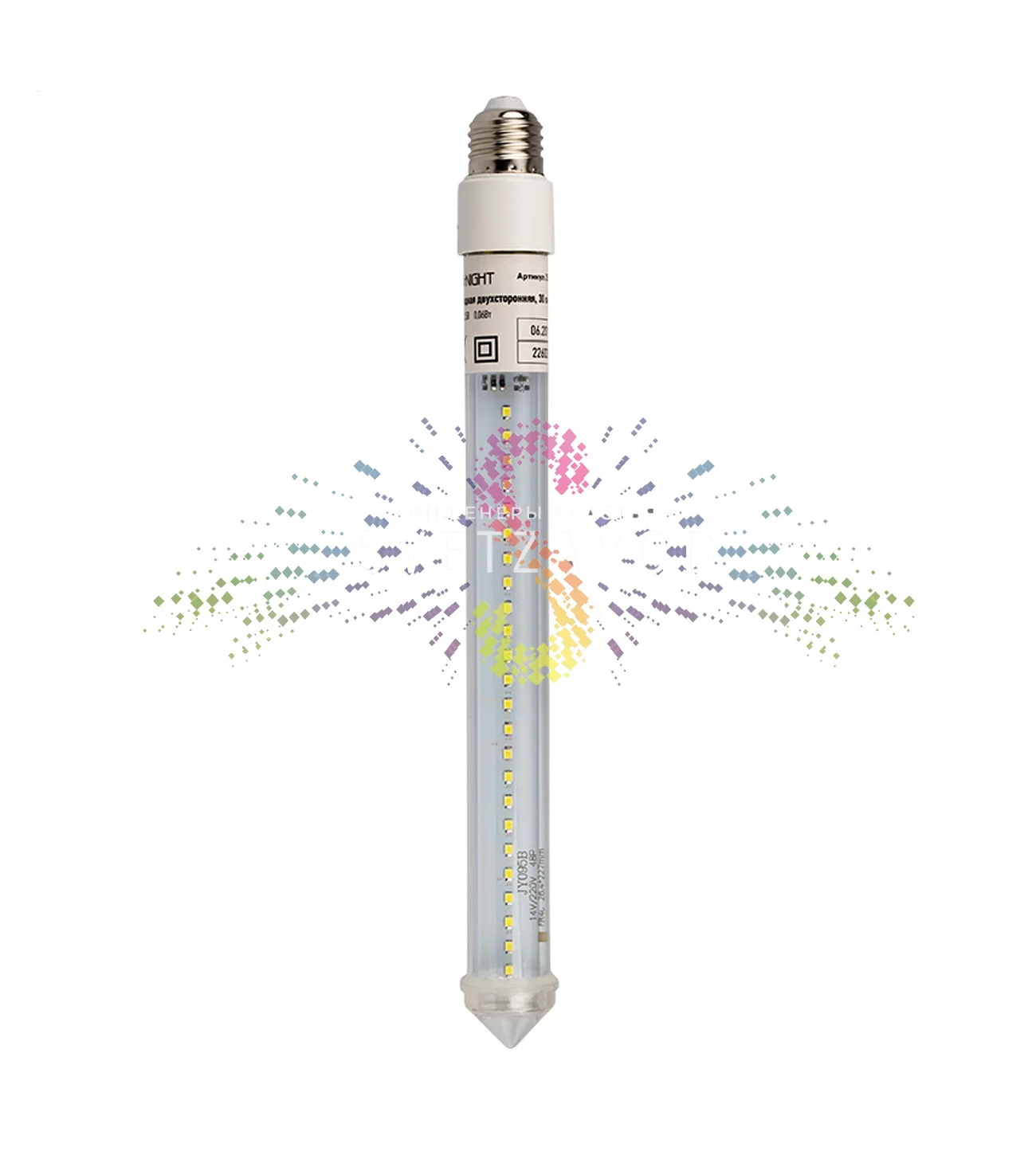 Технологичная начинка: В основе — 48 ярких светодиодов холодного белого свечения, расположенных в прозрачной пластиковой колбе. Такое решение обеспечивает высокую светоотдачу при минимальном энергопотреблении всего 4 Вт. Двусторонняя конструкция гарантирует, что эффект «таяния» будет виден с любого ракурса, создавая объемную световую фигуру.