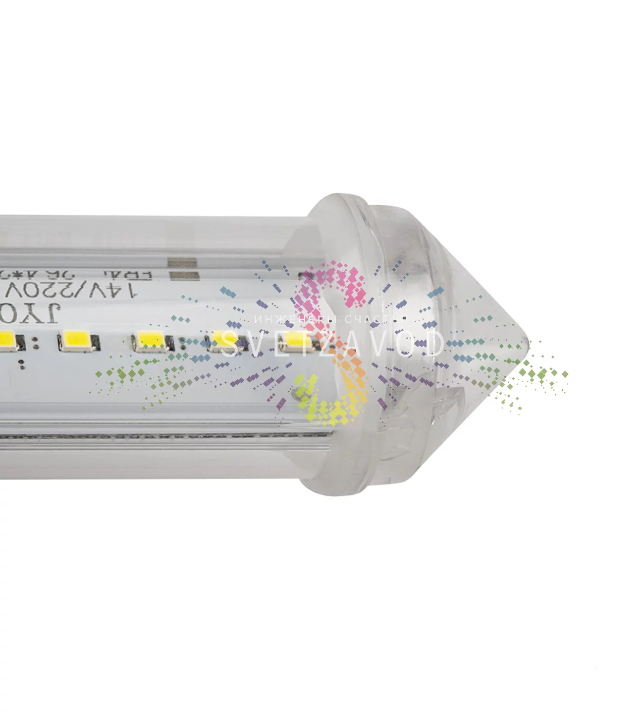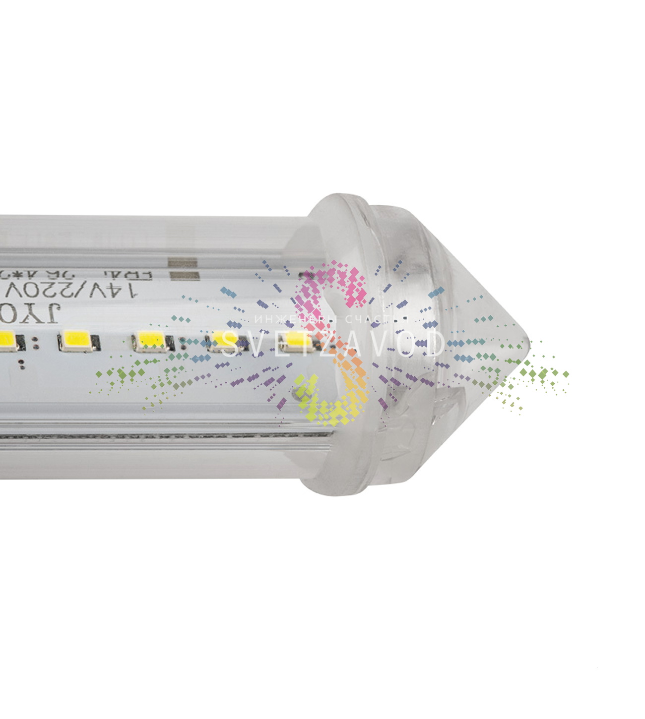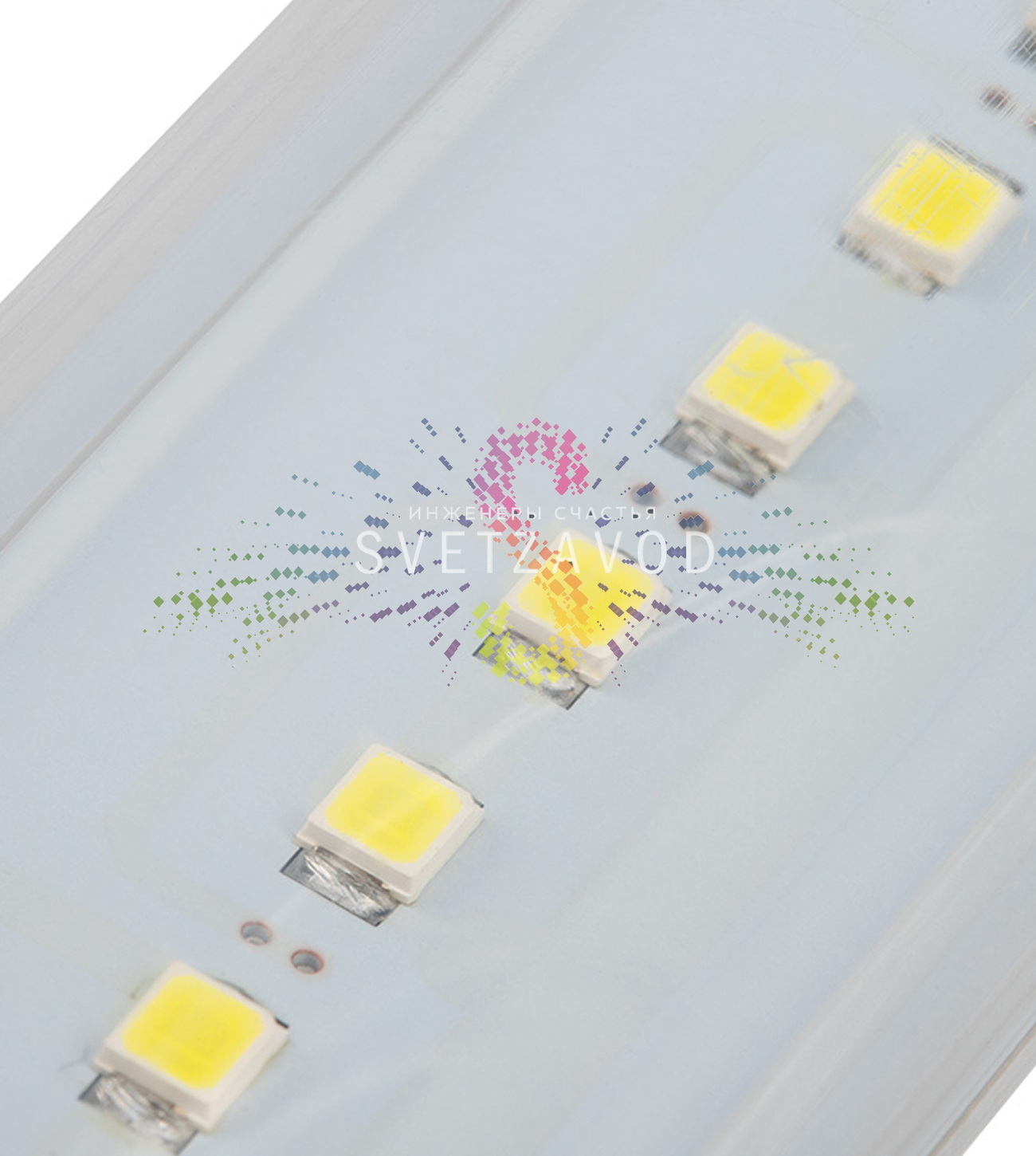 Лампа выполнена в виде прозрачной пластиковой трубки, внутри которой закреплена двусторонняя плата со светодиодами. Такая конструкция обеспечивает равномерное круговое свечение и высокую устойчивость к вибрациям.