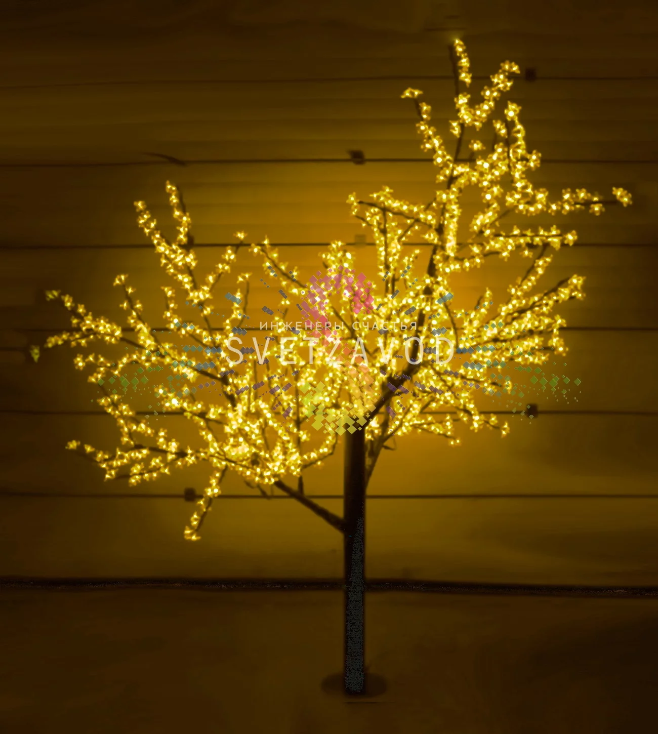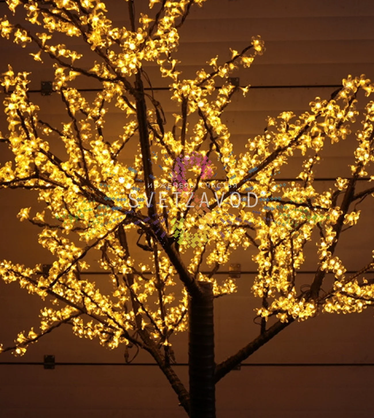 Инженерный подход: Конструкция из 24 ветвей с равномерным распределением 1728 светодиодов создает объемную трехмерную структуру. Желтое свечение оптимальной интенсивности создает уютную атмосферу без излишней яркости. Конструкция разработана для устойчивости к ветровым нагрузкам и перепадам температур.