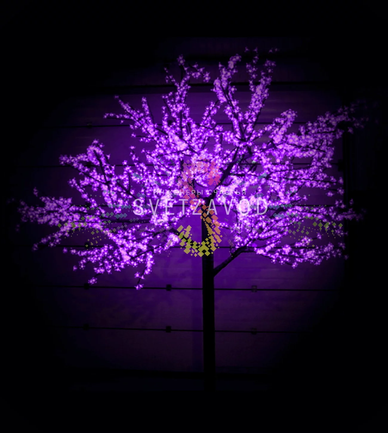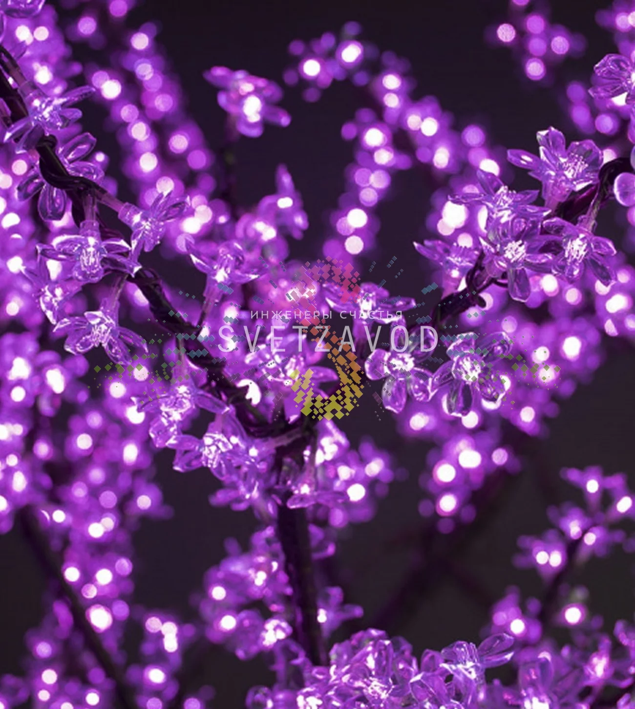 Искусство и технологии: Светодиодное дерево Сакура высотой 3,6 метра с диаметром кроны 3 метра создает неповторимую атмосферу восточной эстетики. Фиолетовое свечение 2688 светодиодов превращает любое помещение или уличную территорию в место притяжения. Уникальная конструкция с 24 ветвями обеспечивает равномерное и насыщенное освещение, создавая эффект вечно цветущего дерева.