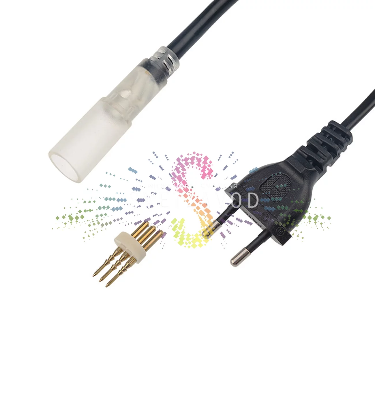 Комплект разработан для трехжильного дюралайта 3W и включает три ключевых элемента: шнур питания с выпрямителем и коннектором, иглу для точного соединения и защитную заглушку. Инженерный подход обеспечивает многоуровневую защиту от влаги и механических повреждений.