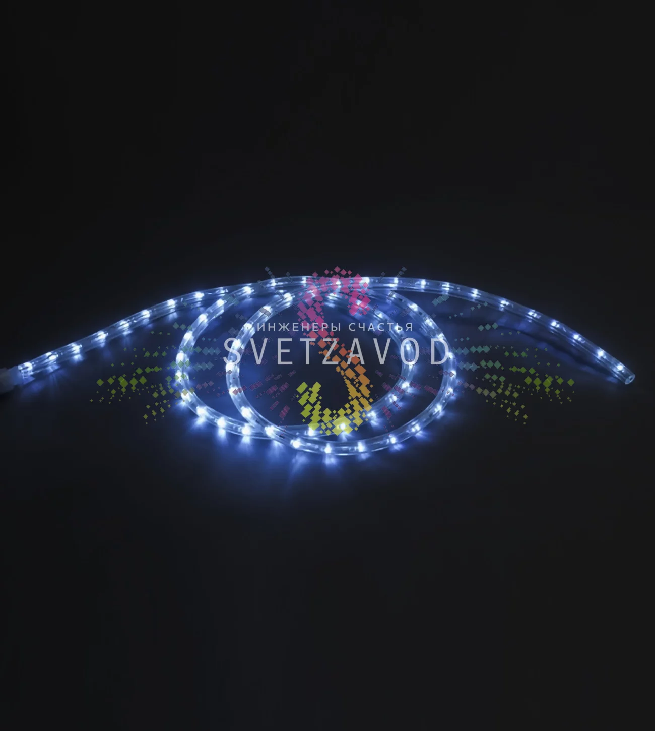 Шнур диаметром 13 мм имеет прочную прозрачную ПВХ-оплетку, устойчивую к ультрафиолету и перепадам температур от -35°C до +45°C. Внутри расположены 3 жилы и цепочка из 36 DIP-светодиодов на метр с углом свечения 180°, что гарантирует равномерную световую линию без темных промежутков.