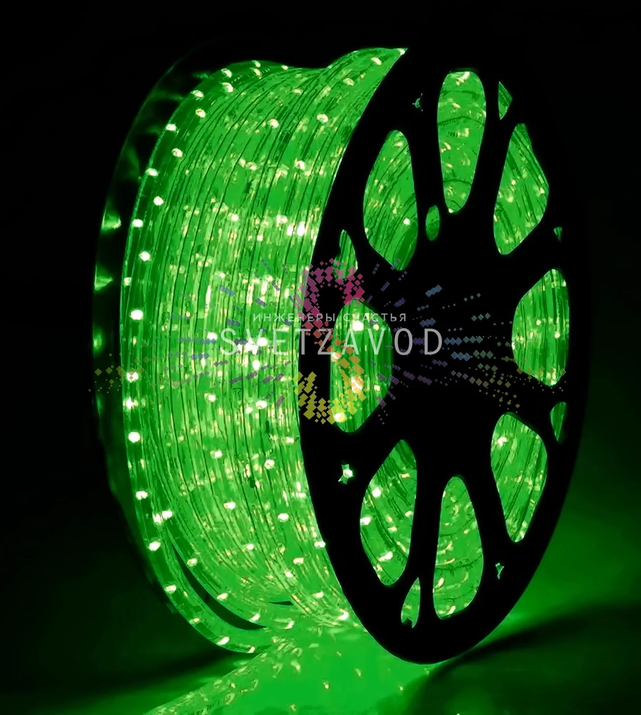 Гибкий шнур диаметром 13 мм с 36 яркими зелеными светодиодами на метр позволяет создавать сложные контуры и фигуры. Шаг резки 2 метра дает гибкость в расчете материала, а бухта 100 метров — оптимальный объем для большинства проектов по оформлению витрин и фасадов.