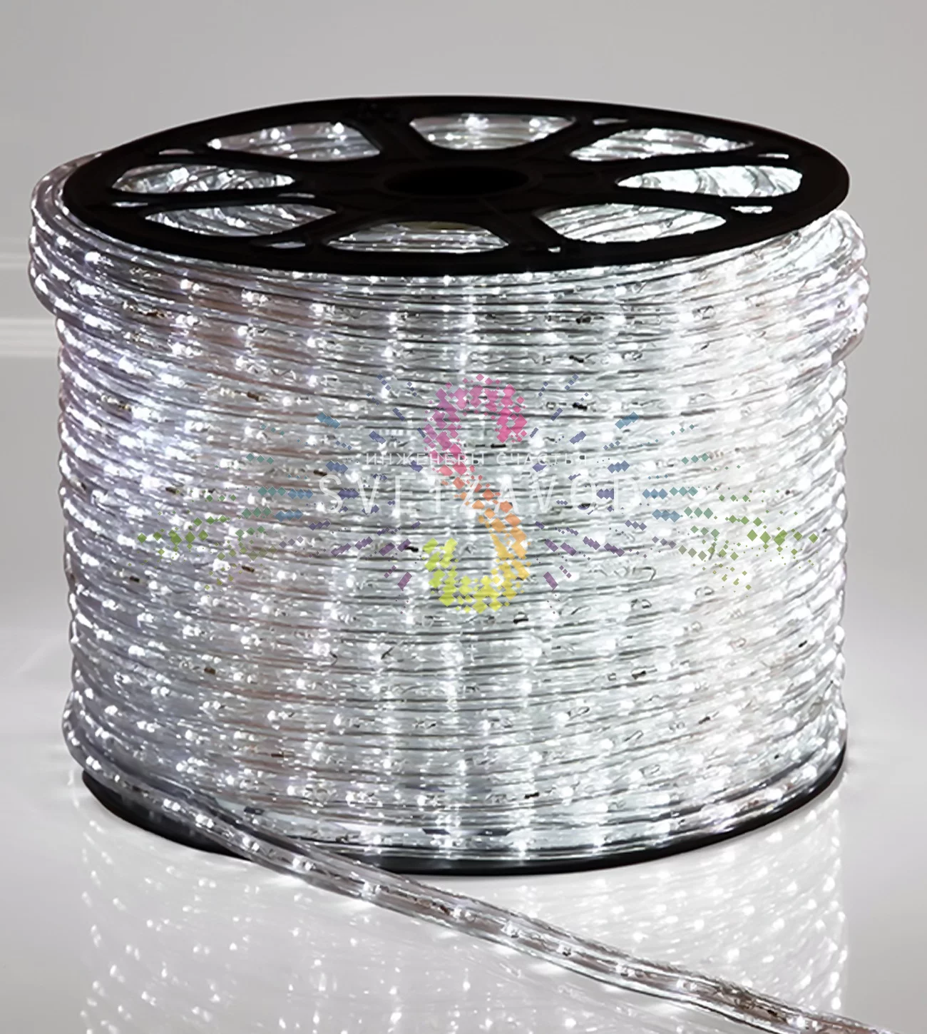 Этот гибкий световой шнур выполнен по классической и проверенной технологии. Внутри прозрачной ПВХ-оплетки расположены две токопроводящие жилы и светодиоды, равномерно распределенные по всей длине.