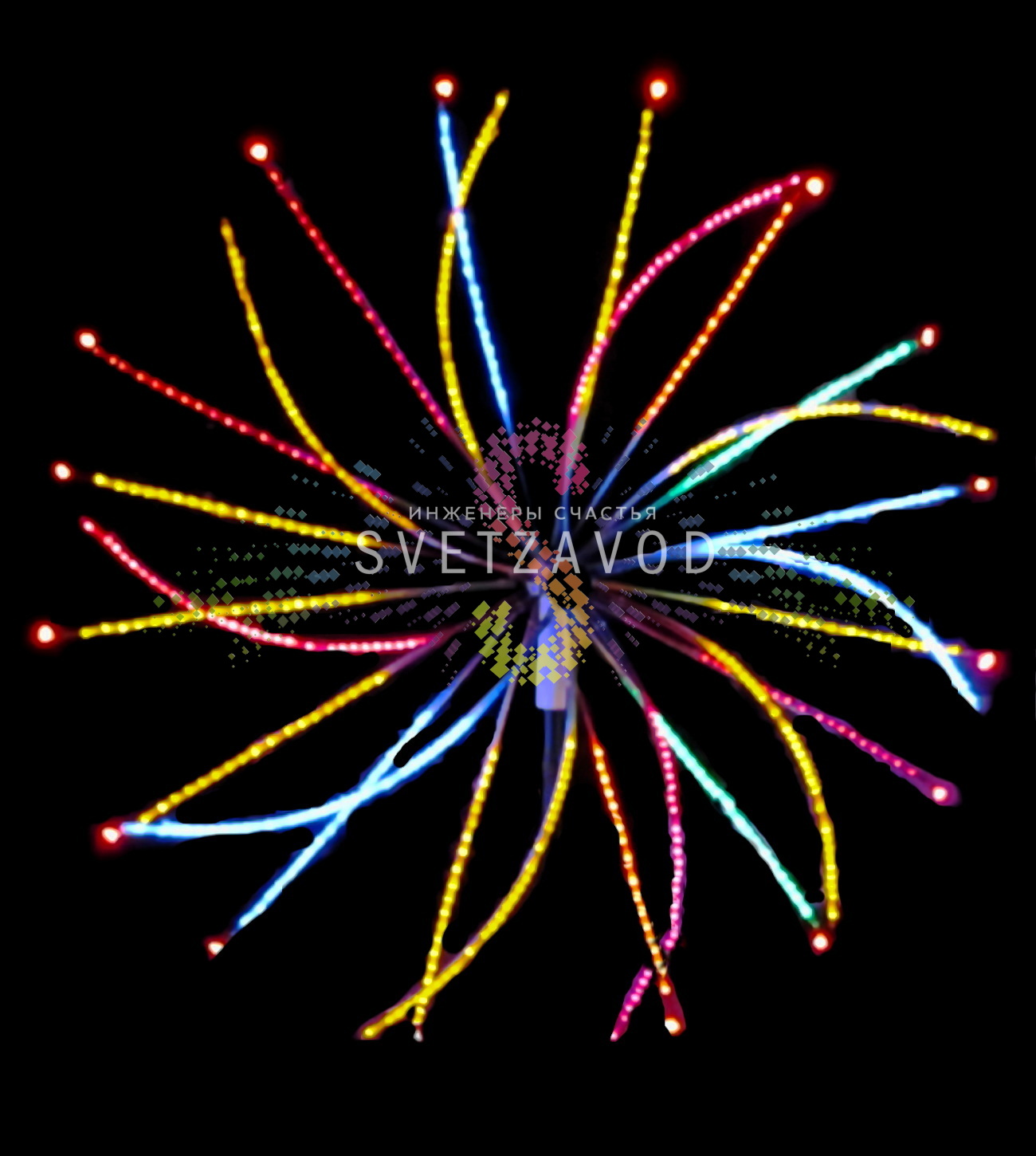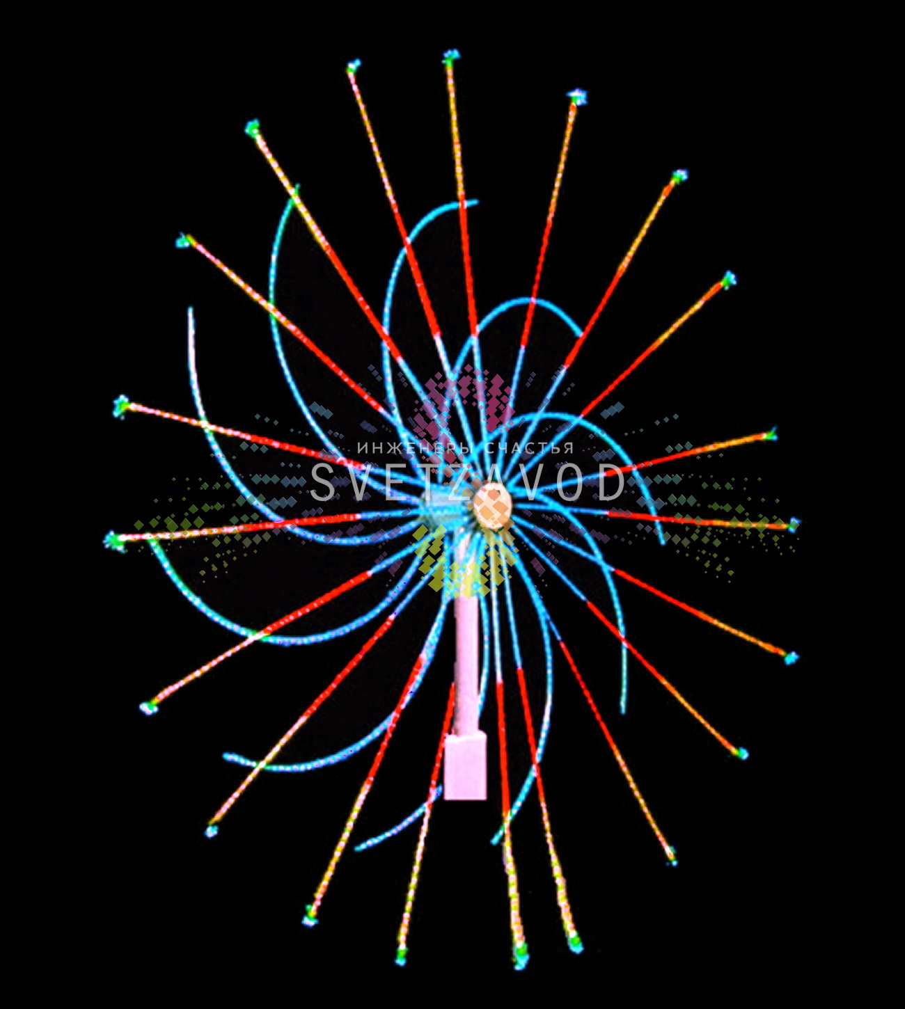 Инновационная технология праздничного освещения: Электрофейерверк "Колесо" диаметром 3 метра создает захватывающие световые эффекты, полностью имитирующие праздничный салют. 30 разноцветных лучей с динамической сменой программ создают незабываемое зрелище при минимальном энергопотреблении. Идеальное решение для замены пиротехники в местах с повышенными требованиями безопасности.