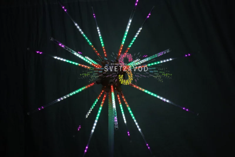 Светодиодный салют "Шар" диаметром 1,2 метра — это 20 разноцветных лучей, создающих объемную, постоянно меняющуюся картину. Управляемый контроллером, он работает от сети 220В и полностью безопасен. Это выгодное предложение для тех, кто ищет, где заказать световой фонтан по хорошей цене.
