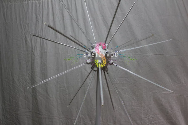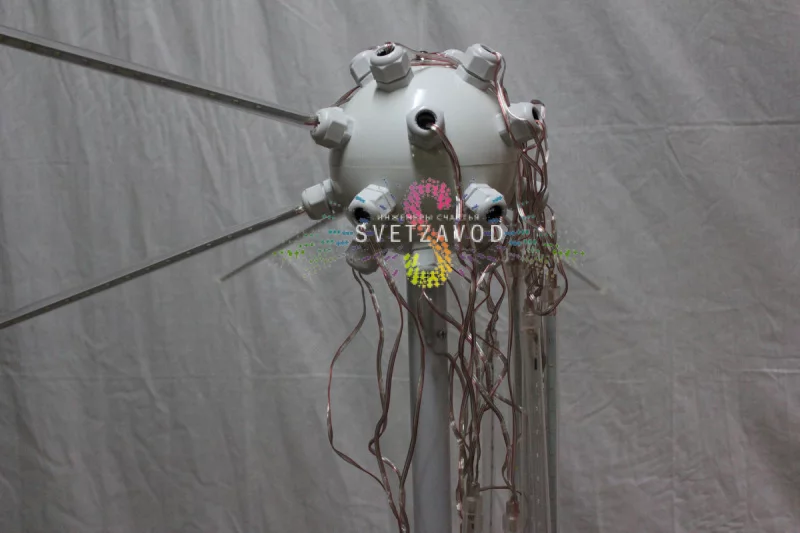 Основа светового фейерверка — прочный металлический каркас, собранный в сферу. К нему крепятся 20 пластиковых лучей с цветными насадками, внутри которых расположены современные светодиоды SMD2835. Такая конструкция обеспечивает жесткость и устойчивость к ветровым нагрузкам при уличном использовании.