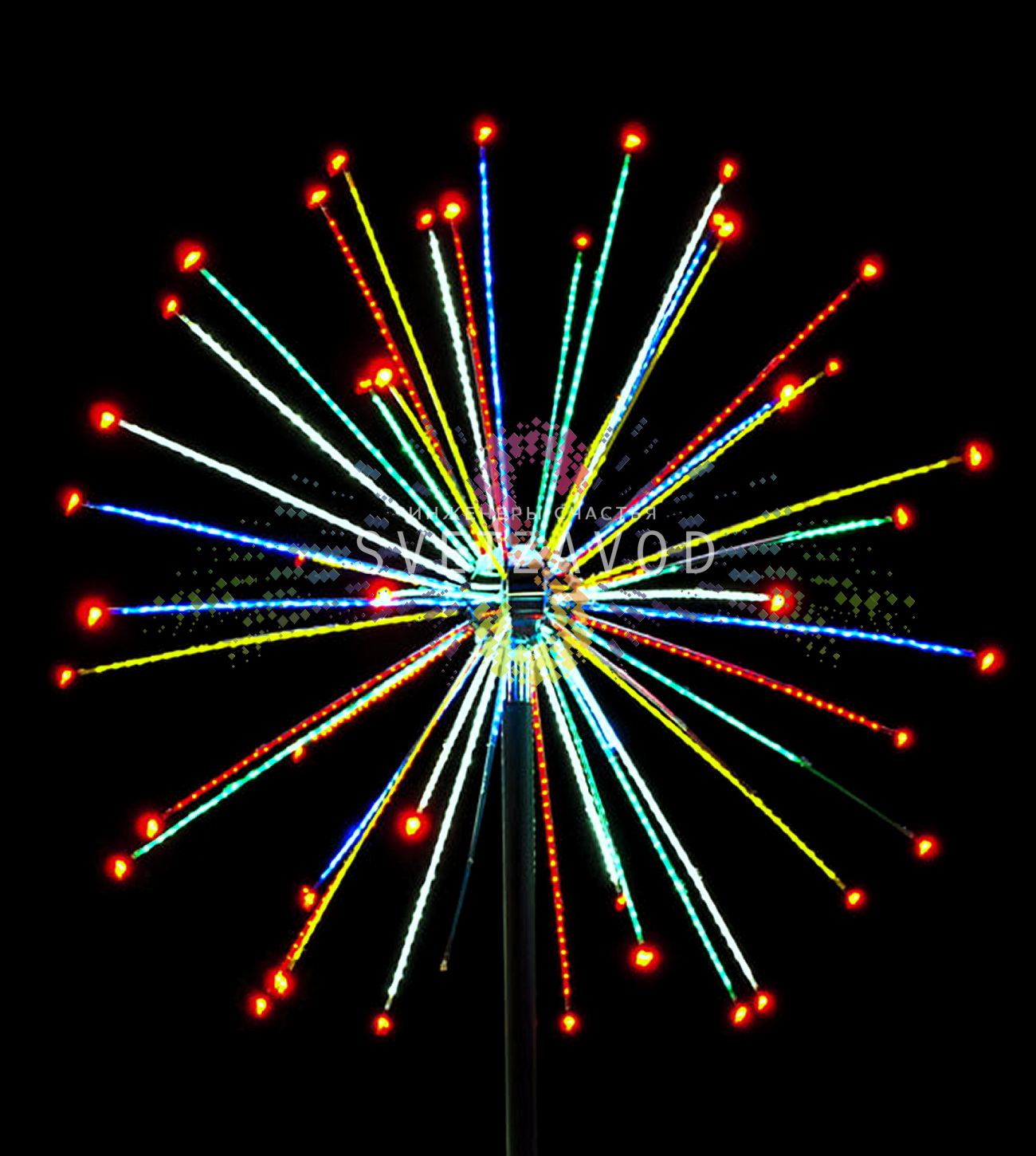 Светодиодный салют состоит из прочного металлического каркаса с пластиковыми лучами. Конструкция устойчива к погодным условиям благодаря степени защиты IP54.
