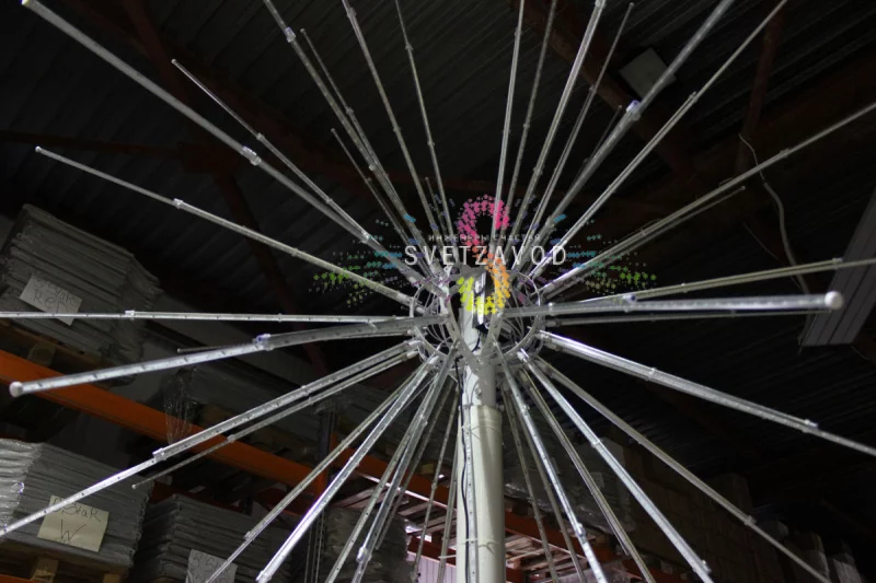 Изделие представляет собой прочный металлический каркас с 52 пластиковыми лучами. Каждый луч оснащен яркими светодиодами SMD5050. Интеллектуальный контроллер с защитой от перенапряжения обеспечивает стабильную работу 12 динамических программ.