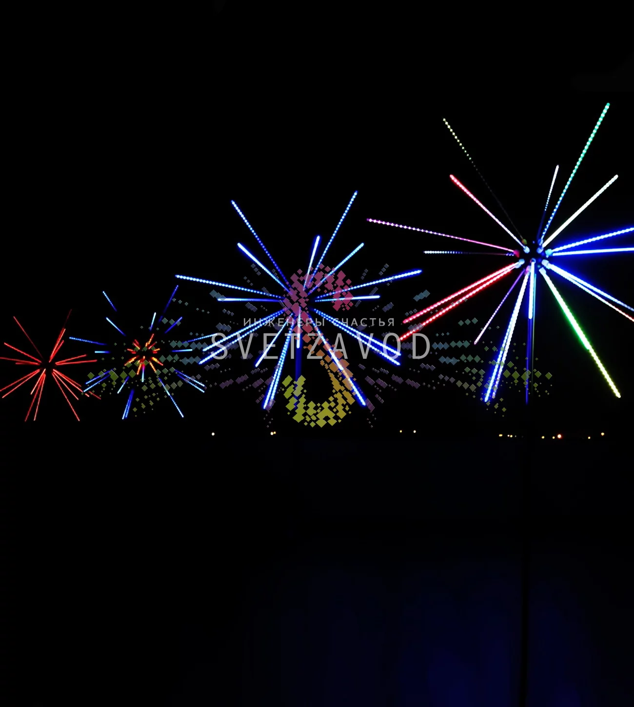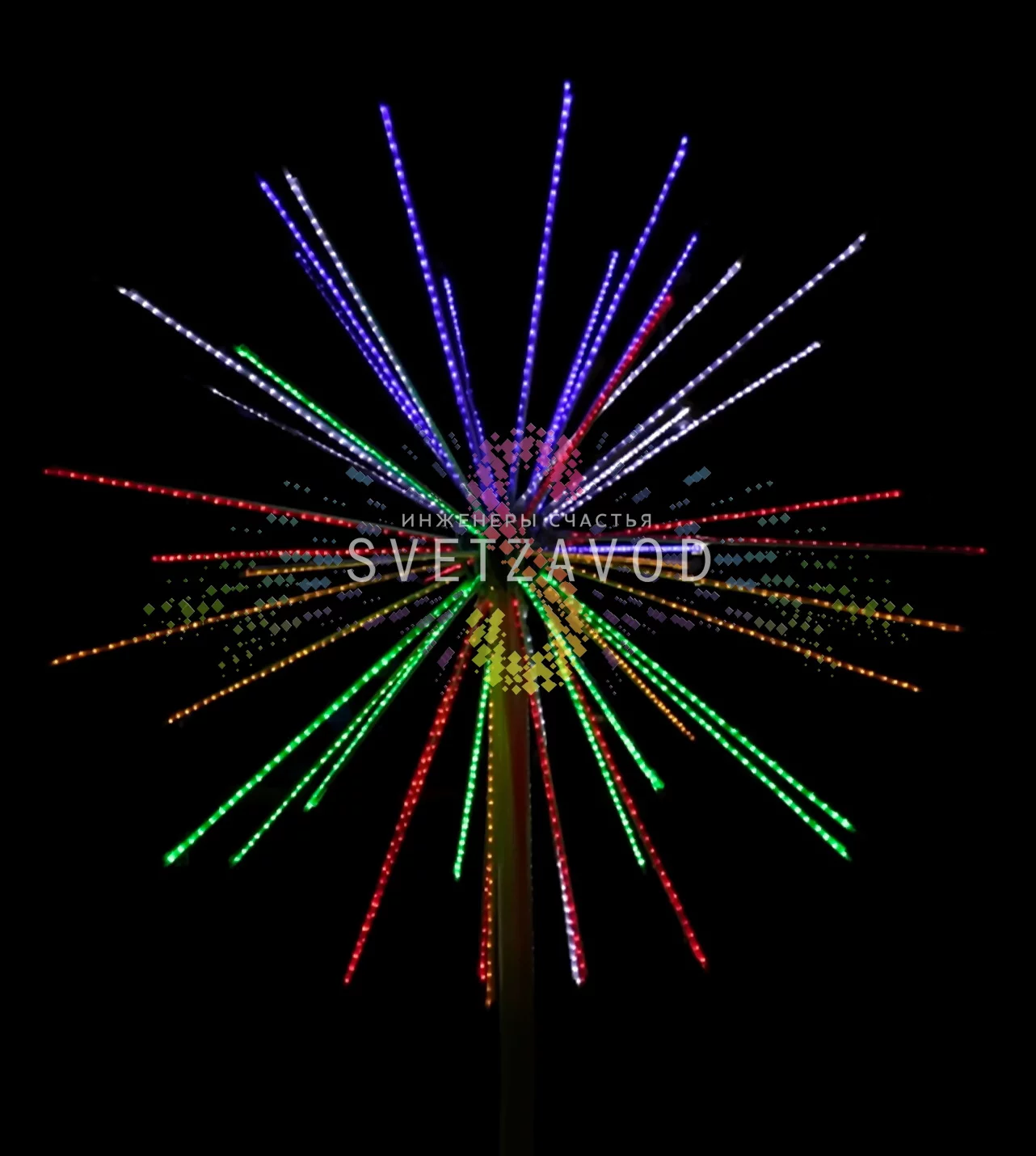 Конструкция диаметром 3 метра с 52 разноцветными лучами и 12 программами анимации обеспечивает яркое световое шоу. Закажите этот светодиодный салют для создания незабываемой атмосферы на вашем мероприятии.