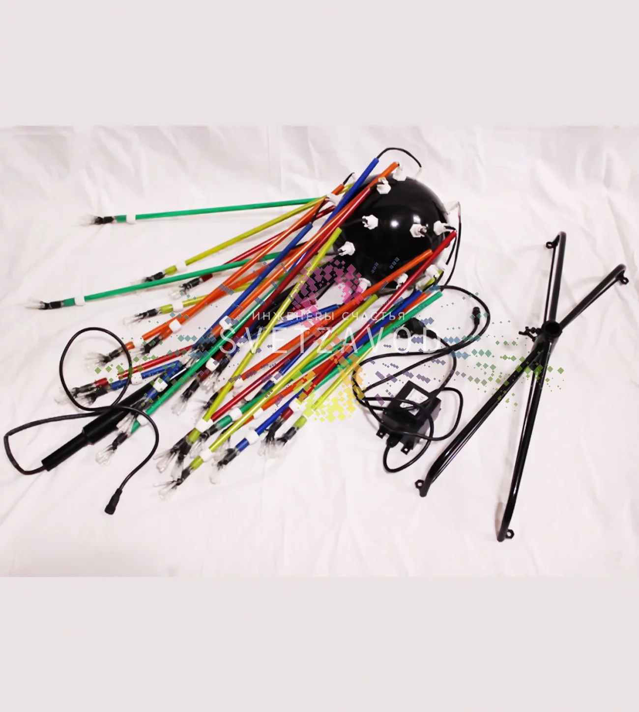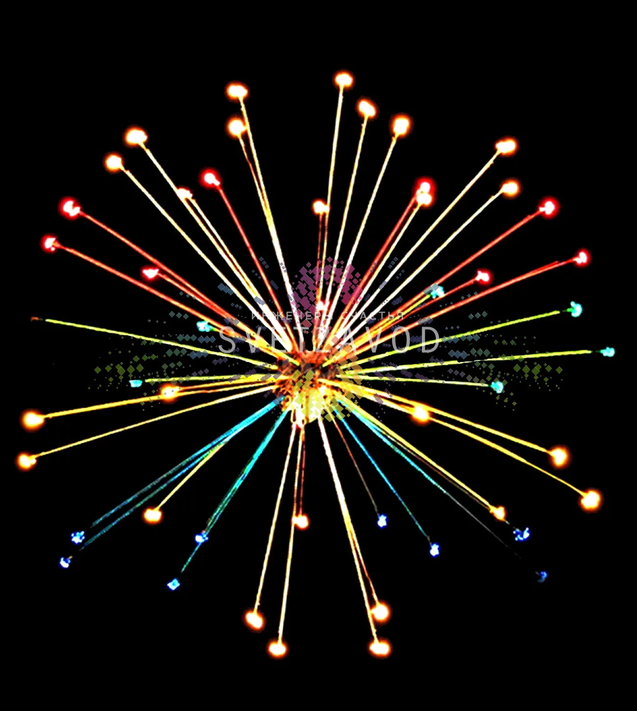 Световая фигура собрана на основе прочного пластикового шара, от которого расходятся 25 гибких лучей с цветными насадками. В основе — надежные DIP-светодиоды со сроком службы 40 000 часов. Вся электроника защищена от перепадов напряжения и влаги (IP54), что гарантирует стабильную работу под дождем или снегом.