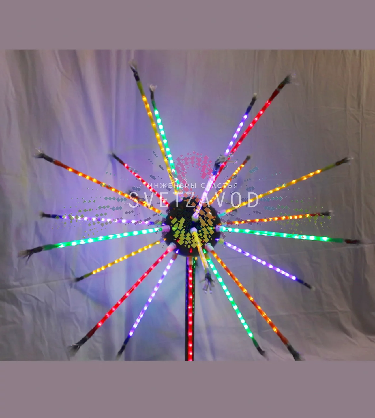 Этот динамический световой фонтан диаметром 1,1 метра с 25 разноцветными лучами станет центром внимания на вашем мероприятии. Яркие светодиоды, плавные переливы и несколько программ работы создают неповторимую атмосферу, сравнимую с настоящим фейерверком. Закажите эту динамическую гирлянду в нашем интернет-магазине и преобразите пространство.