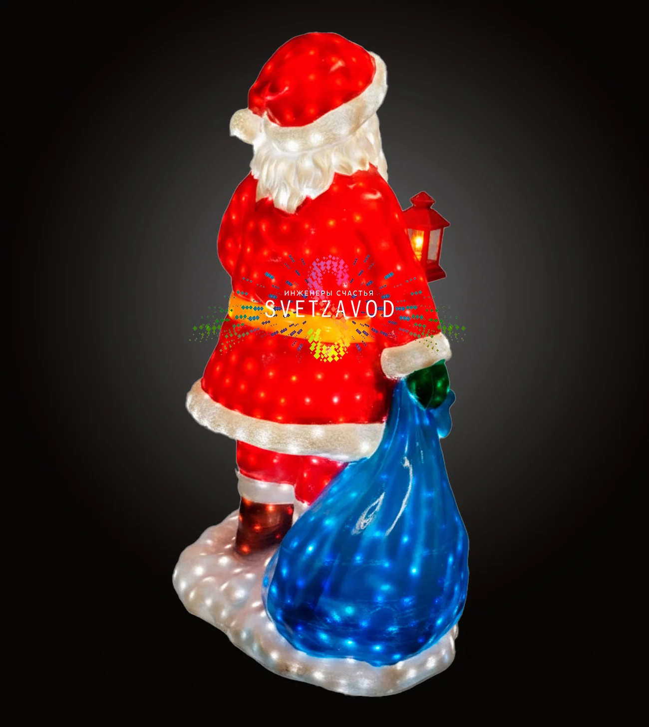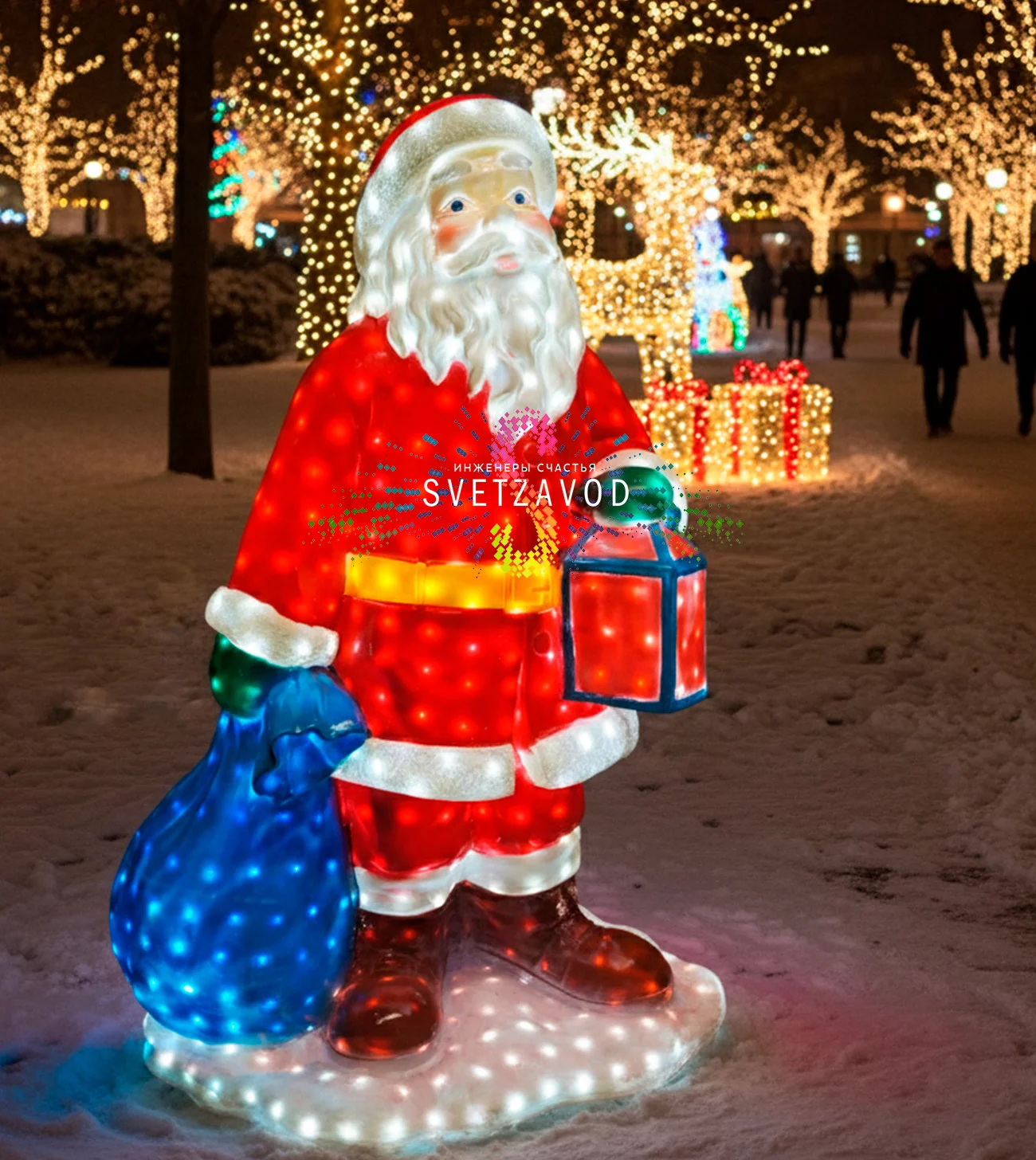 Решение: Объемная светодиодная фигура Дед Мороз высотой 120 см. Это готовая композиция из стекловолокна с мешком подарков и встроенной подсветкой, которая станет центром внимания в любом новогоднем ансамбле. Такие большие уличные фигуры — это выгодное вложение для бизнеса и способ преобразить свой двор для частных лиц. Если вам нужны уникальные садовые фигуры на заказ, мы всегда готовы обсудить индивидуальный проект.