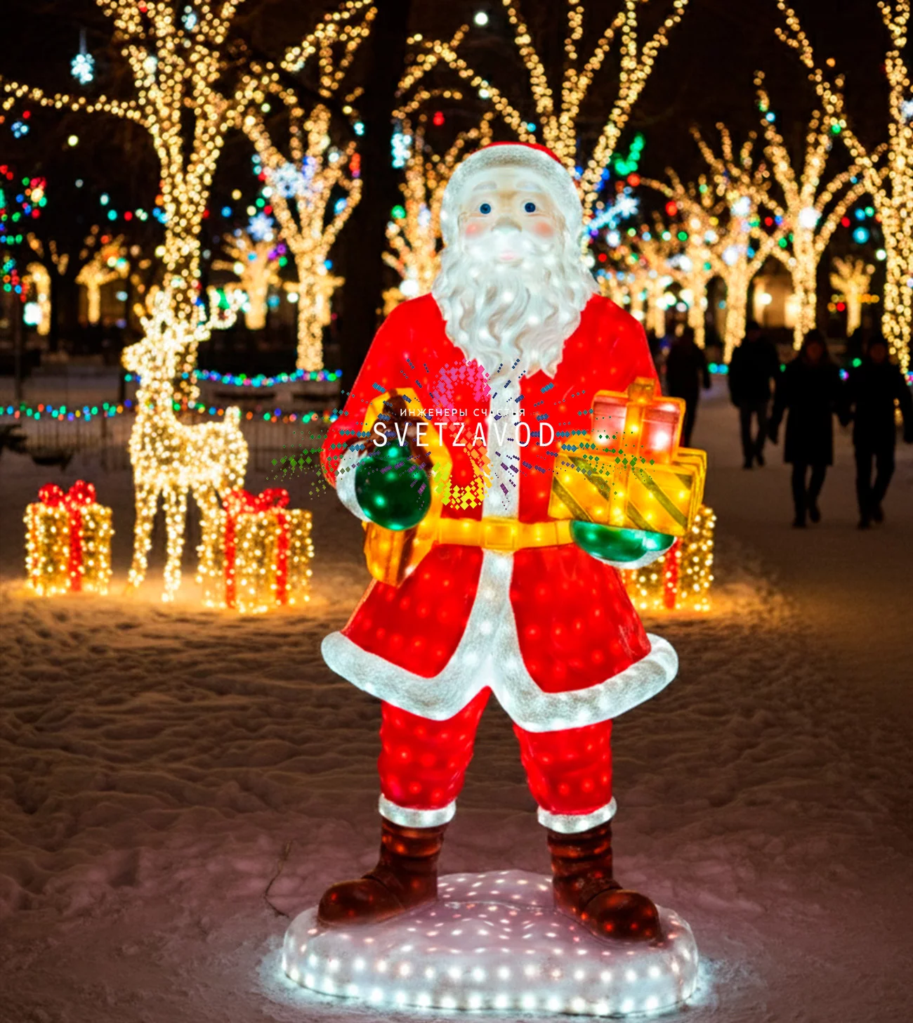Эта светодиодная фигура высотой 170 см — не просто украшение, а инвестиция в праздничный антураж на многие годы. Изготовленная из прочного стекловолокна, она выдерживает уличные условия, а яркая LED-подсветка делает ее главным акцентом в вечернее время. Идеально подходит для оформления входных групп, торговых залов, парков и частных территорий.