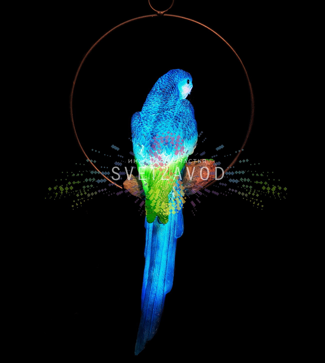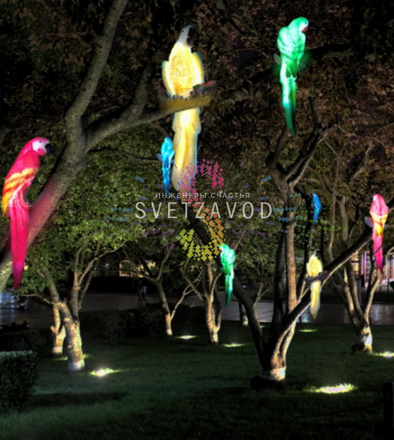 Готовое решение для яркого декора: Набор из 5 разноцветных попугаев высотой 49 см создает законченную композицию. Фигуры изготовлены из прочного стекловолокна со встроенной светодиодной подсветкой, работающей от безопасного напряжения 24В через трансформатор в комплекте.