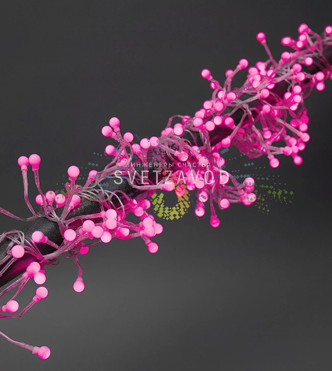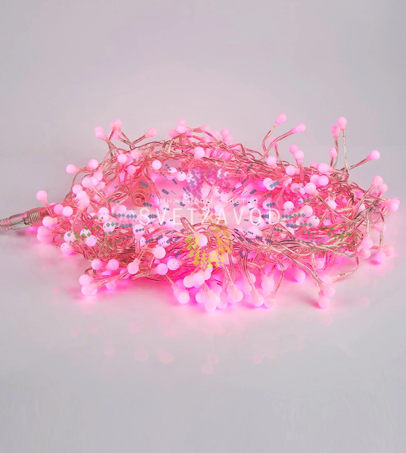 Гирлянда изготовлена из прозрачного ПВХ розового цвета, что обеспечивает высокую светопропускаемость и создает эффект парящих светящихся шариков диаметром 1 см. Прозрачный провод делает конструкцию практически невидимой, акцентируя внимание на свете. Благодаря светодиодной технологии, изделие отличается низким энергопотреблением (35 Вт) и долгим сроком службы — до 40 000 часов.