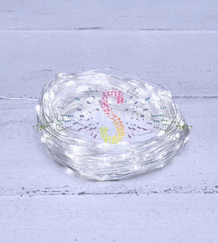 Гирлянда представляет собой 20-метровый прозрачный шнур с 200 светодиодами белого холодного свечения, расположенными через каждые 10 см. Это обеспечивает равномерное и яркое освещение без тёмных провалов.