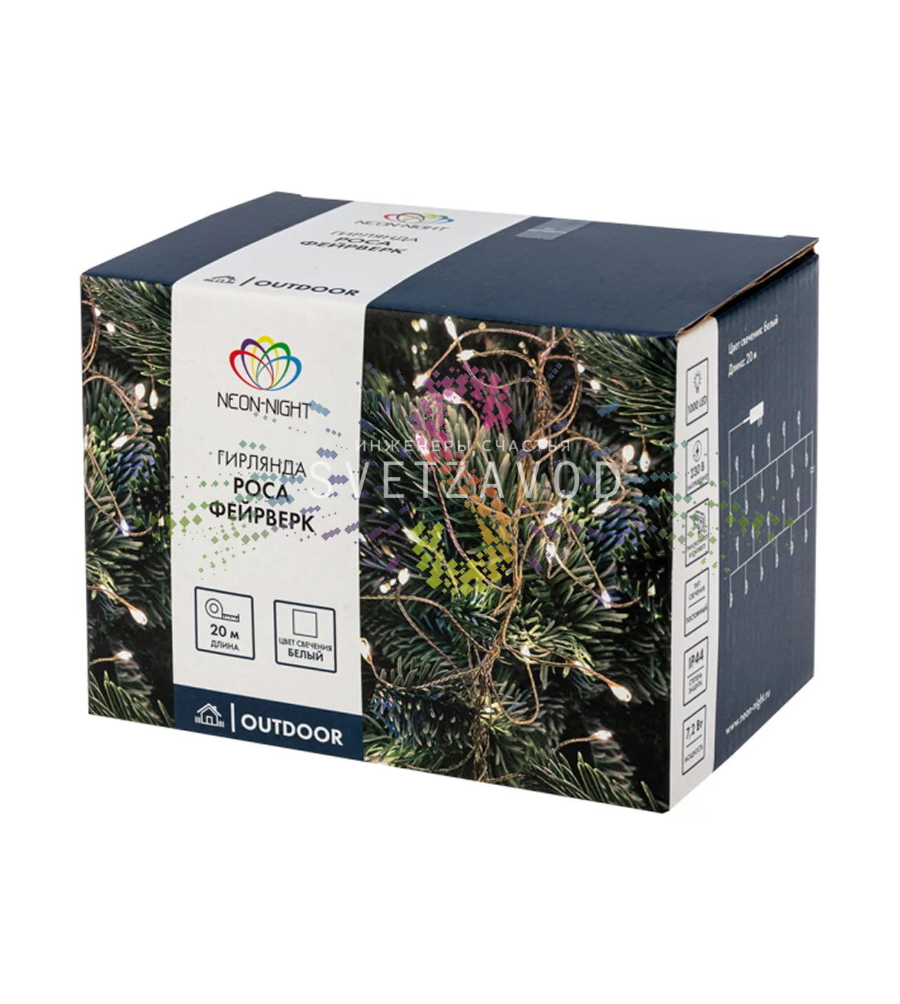 Техническая основа: Гирлянда собрана на основе 1000 ярких светодиодов, закрепленных на тонком прозрачном проводе из ПВХ. Низкое рабочее напряжение 31В от отдельного блока питания — это залог электробезопасности. Степень защиты IP44 означает, что гирлянду можно использовать на улице, не опасаясь брызг воды и пыли.