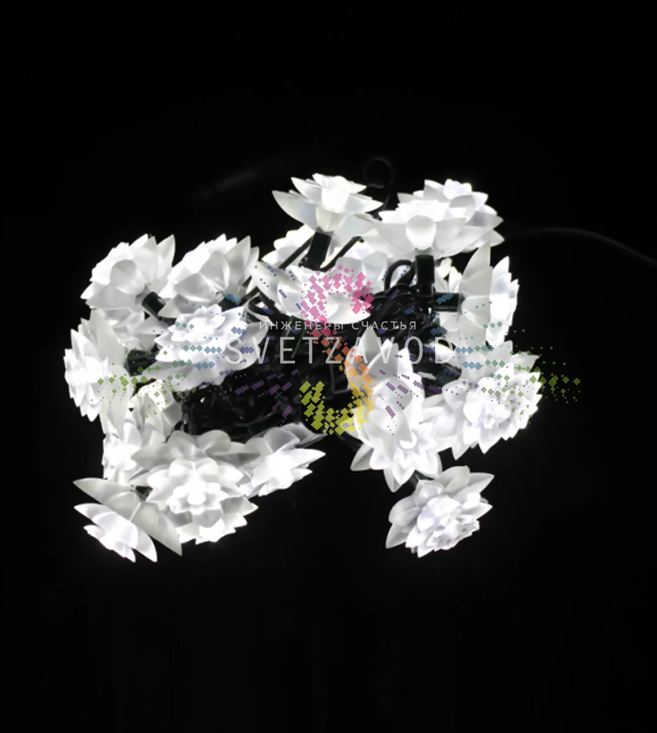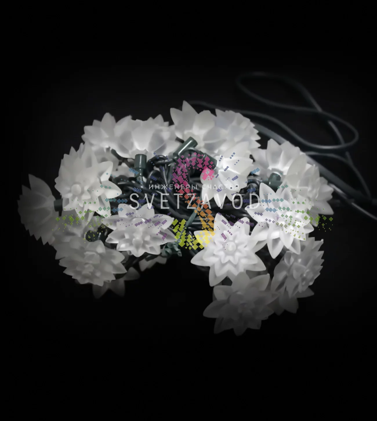Универсальность: Фигурные насадки в виде хризантем делают эту гирлянду не просто источником света, а самостоятельным декором. Она подходит как для создания уютной атмосферы, так и для профессионального оформления коммерческих объектов.