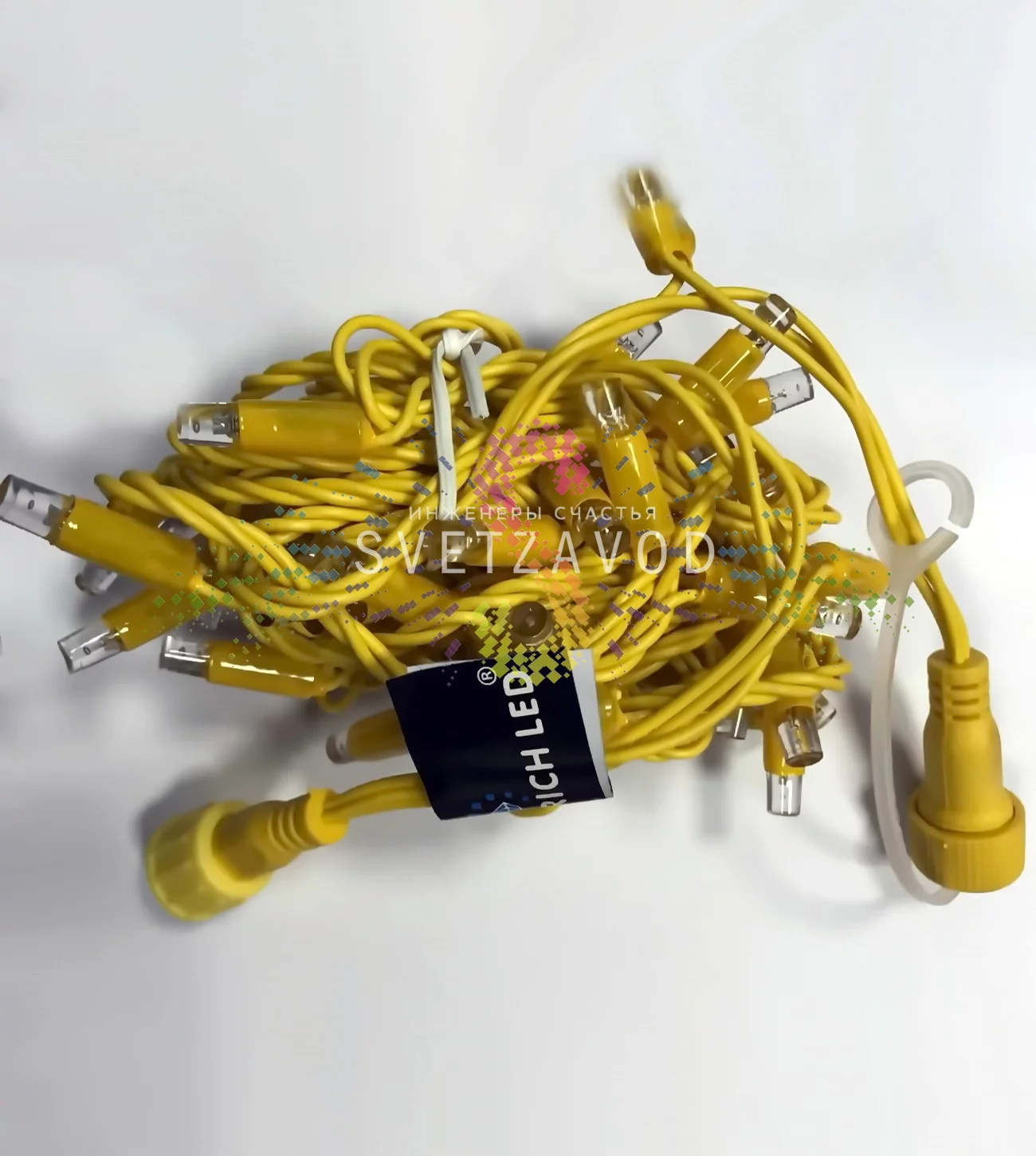 Инженерный подход: Конструкция гирлянды оптимизирована для долговечной работы в сложных условиях. Каждый светодиод типа DIP защищен колпачком, а провод в желтой ПВХ-оболочке устойчив к ультрафиолету, перепадам температур от -40°C до +50°C и механическим воздействиям.