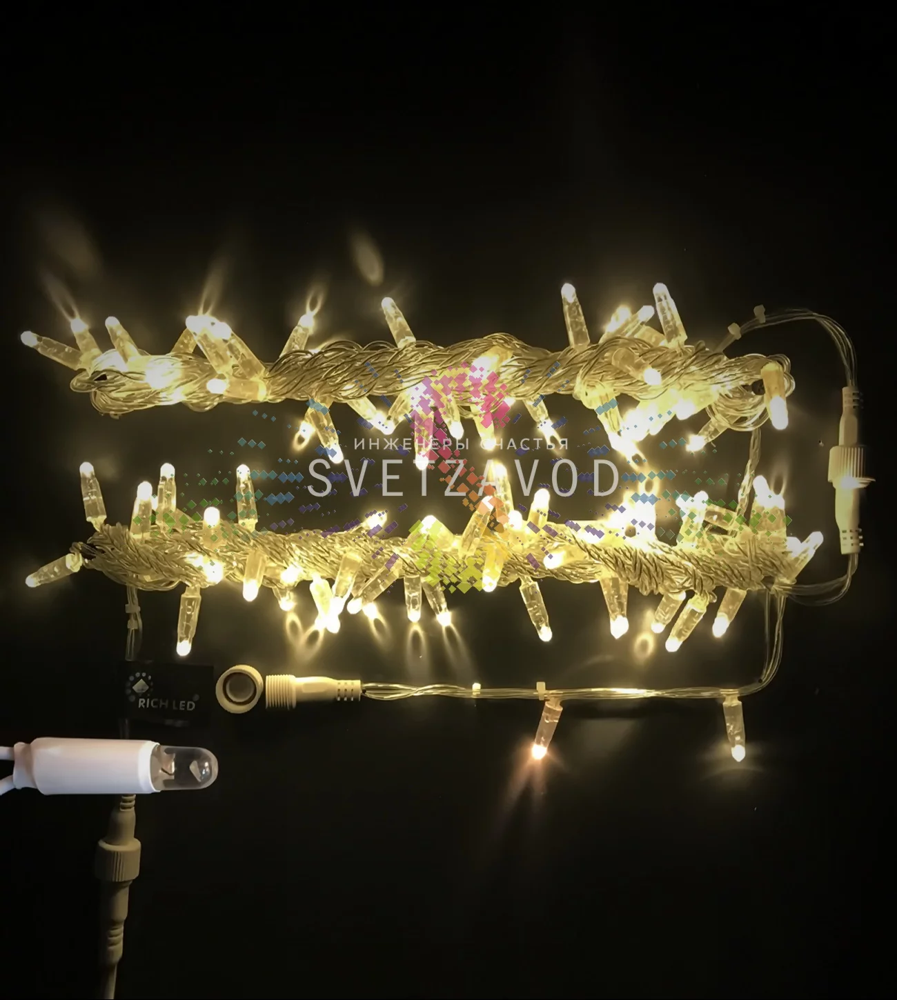 Инженерный подход: Гирлянда изготовлена с применением надежных DIP-светодиодов, размещенных в прозрачных защитных колпачках. Прозрачная оболочка из ПВХ обеспечивает эффективное светорассеивание теплого белого света (3000K), механическую защиту и гибкость для создания световых фигур.