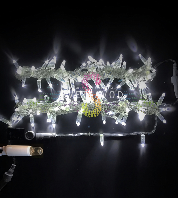 Основа долговечности: Конструкция гирлянды продумана для профессионального использования. Прозрачный провод из морозостойкого ПВХ сохраняет эластичность при -20°C и не желтеет на солнце. Каждый из 100 светодиодов защищен индивидуальным колпачком и имеет встроенную защиту от перенапряжения, что гарантирует стабильную работу всей цепи.