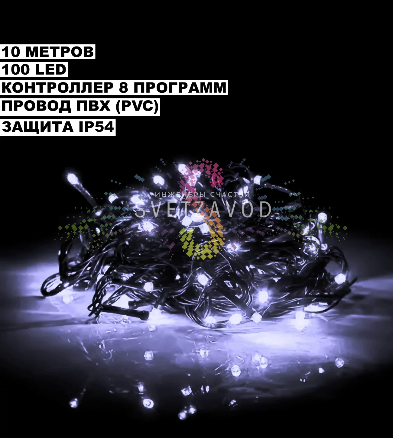 Гирлянда длиной 10 метров с белыми холодными светодиодами создает четкие световые акценты. Черный провод из ПВХ малозаметен в темноте, обеспечивая аккуратное оформление. Благодаря степени защиты IP54, ее можно использовать для улицы и помещения, не опасаясь пыли и брызг воды.