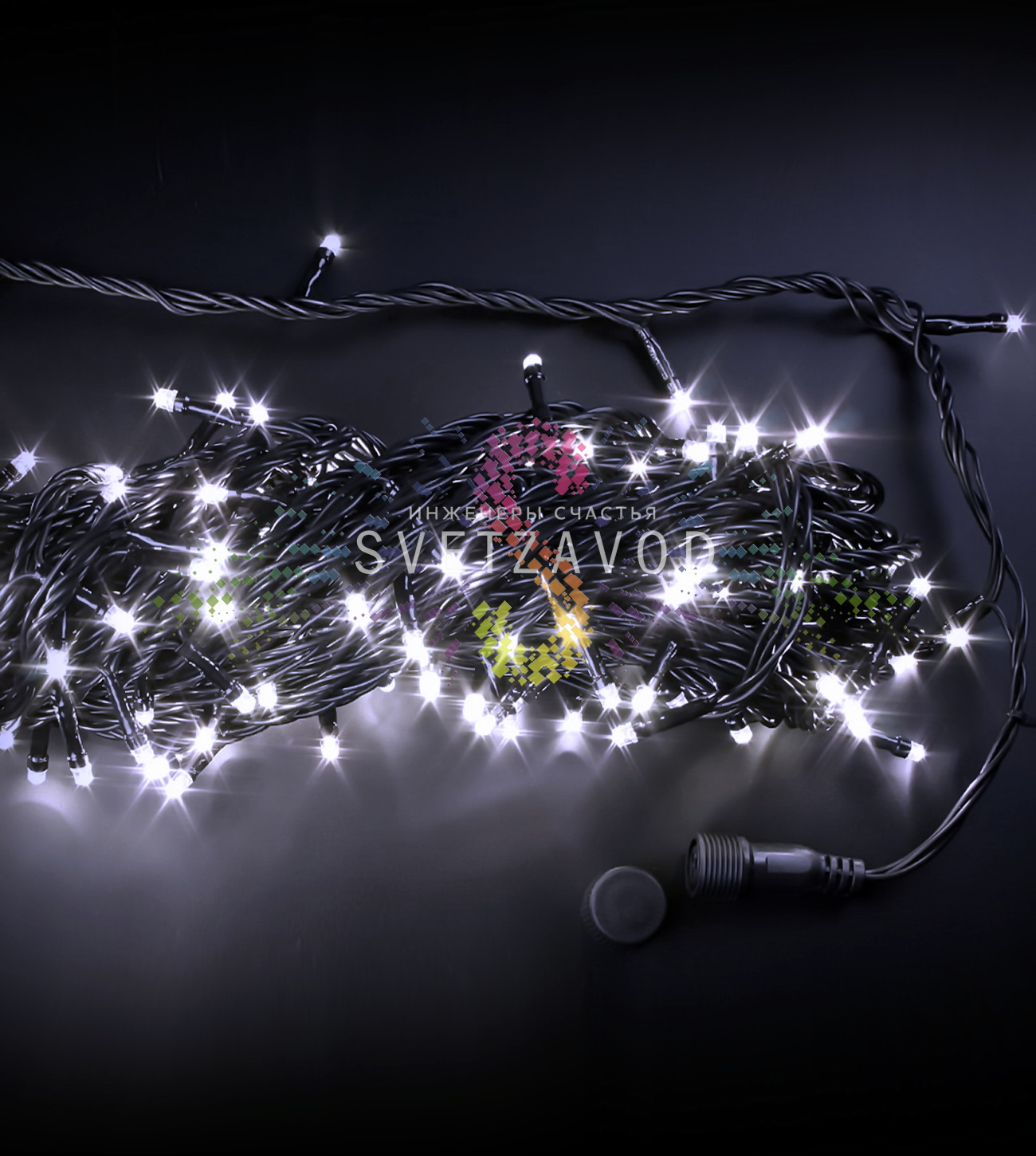Продуманная конструкция: Гирлянда изготовлена из качественного черного ПВХ материала, обеспечивающего гибкость и долговечность. Белые светодиоды создают равномерное свечение, а специальное расположение ламп по технологии "твинкл" имитирует эффект мерцания звезд. Напряжение питания 220В позволяет подключать изделие непосредственно в розетку.