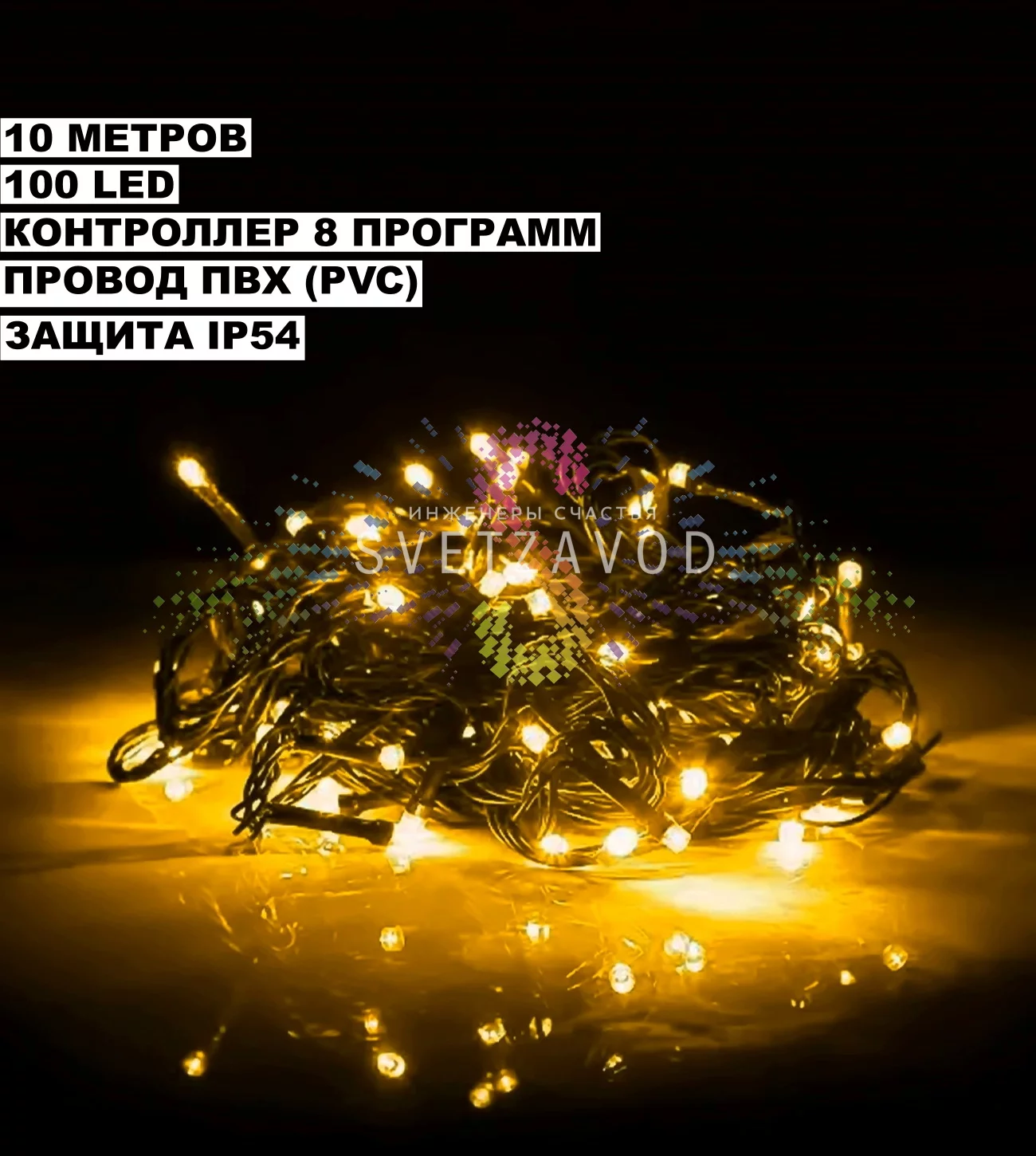 Гирлянда длиной 10 метров с 100 желтыми светодиодами в черной ПВХ-изоляции — это надежное и энергоэффективное решение для оформления витрин, фасадов, деревьев и интерьеров. Комплектация блоком питания и класс защиты IP54 позволяют начать использовать ее сразу после покупки.