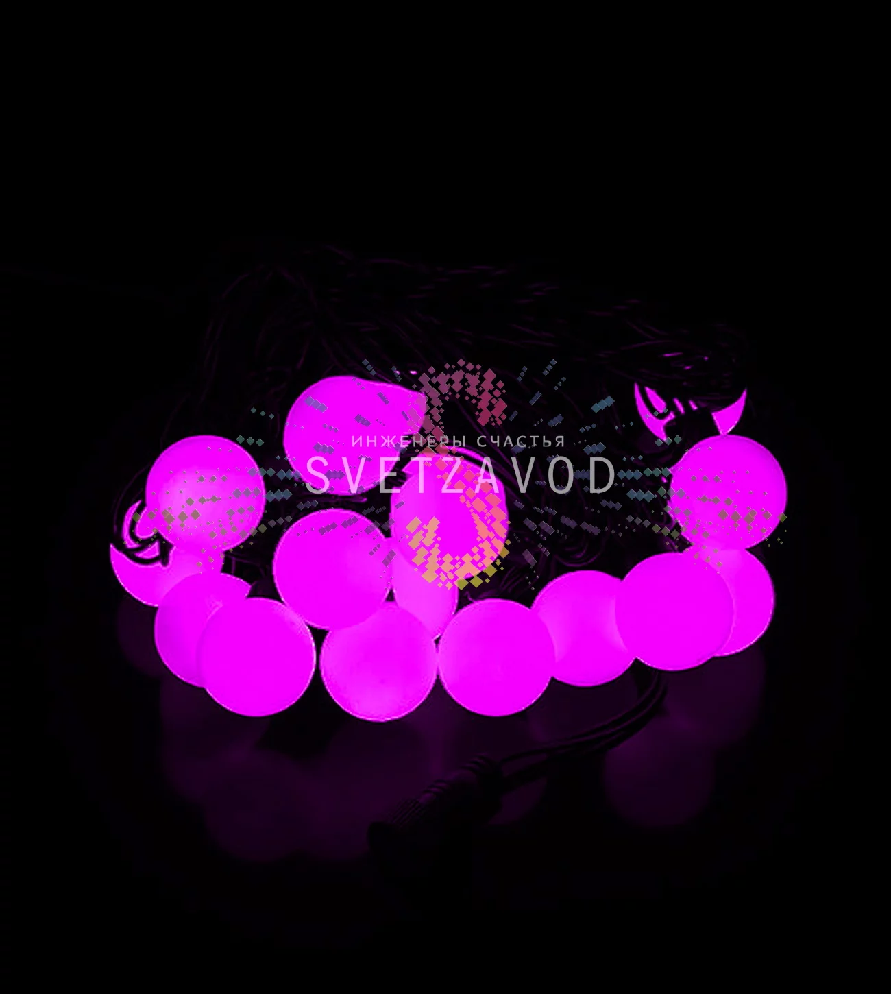 Гирлянда представляет собой 5-метровый черный кабель из ПВХ, на котором закреплены 18 крупных шарообразных плафонов диаметром 38 мм с яркими светодиодами внутри. В комплекте идет блок питания на 220В, что позволяет начать использование сразу после распаковки.