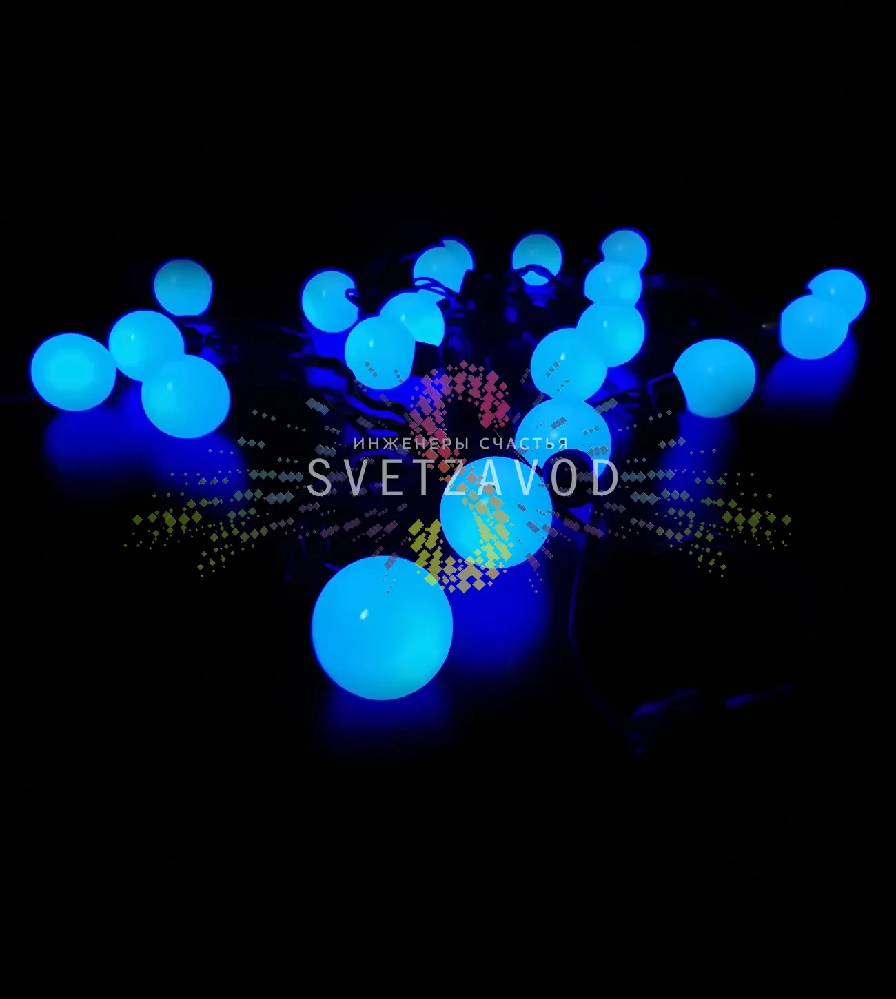 Профессиональный свет для улицы и помещений: Гирлянда Шарики Ø 40мм — это готовое решение для создания праздничной атмосферы и архитектурной подсветки. Если вы ищете, где гирлянда с шариками уличная заказать с гарантией надежности, эта модель с защитой IP65 выдерживает дождь, снег и пыль, работая круглый год. Ее синее свечение идеально подчеркивает контуры зданий, деревьев и витрин, потребляя минимум энергии.