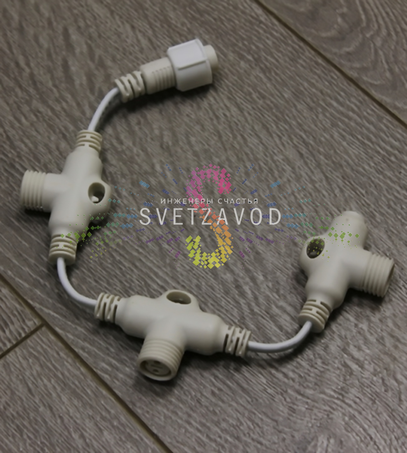 Соединительный шнур на три луча, 30см. Расстояние между лучами - 10см. С помощью соединительных шнуров можно создать многолучевую гирлянду посредством соединения шнуров друг к другу с помощью влагозащищенных коннекторов (папа/мама). Также возможно соединить саму гирлянду Клип Лайт до двух штук посредством влагозащищенных коннекторов (папа/мама).