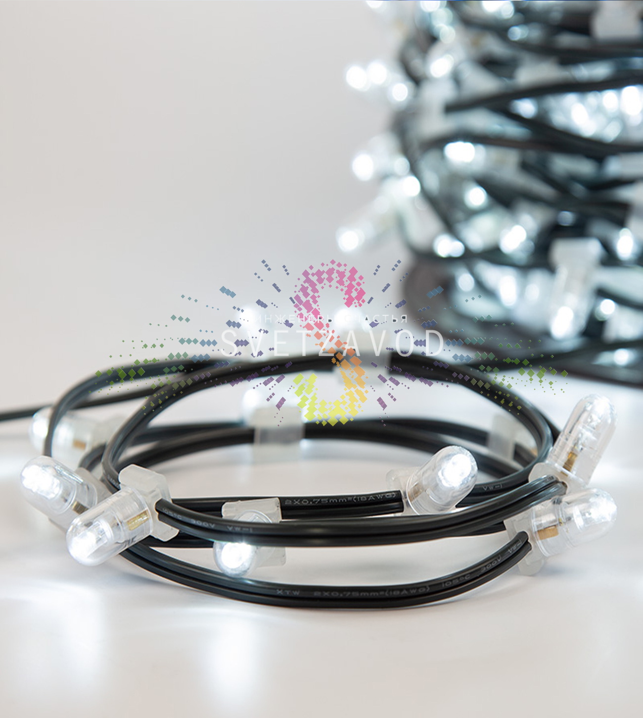 Гирлянда поставляется в бухте 100 метров с темно-зеленым ПВХ-кабелем, который практически незаметен в естественной среде. 665 мощных светодиодов холодного белого свечения расположены с оптимальным шагом для создания равномерного светового потока без темных зон.