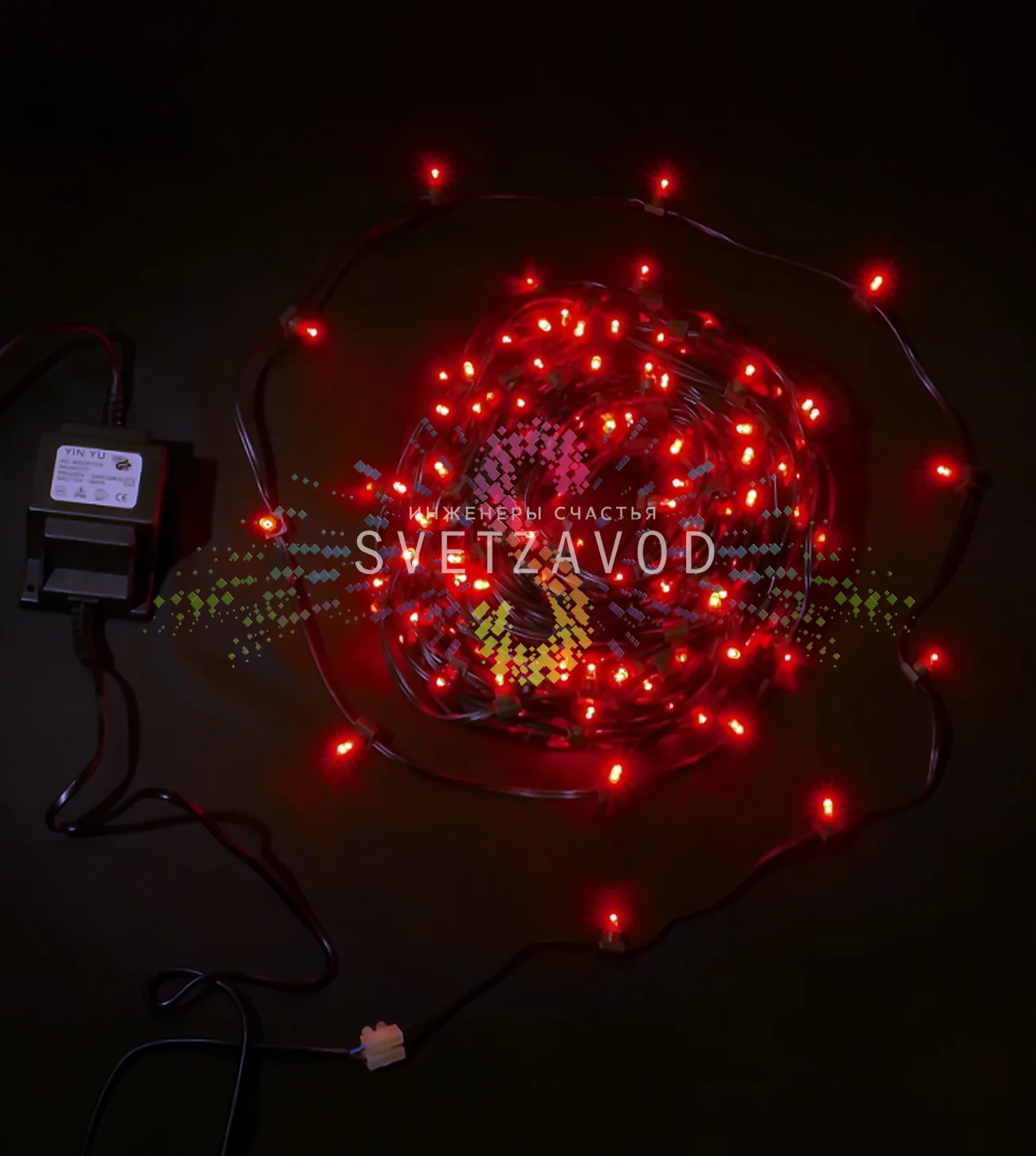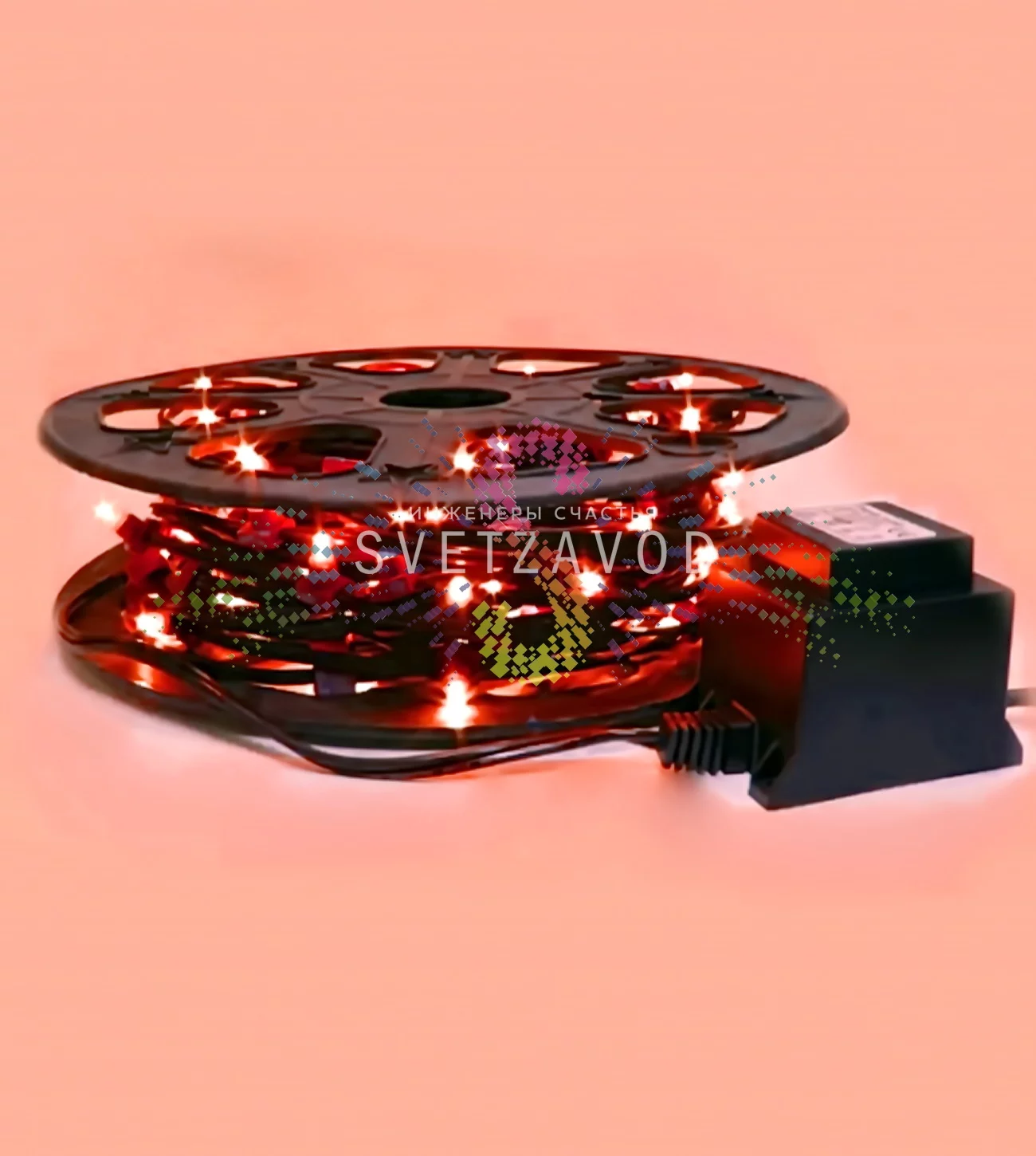 Комплект включает 30 метров гибкого кабеля с 200 яркими светодиодами красного свечения и готовый к работе трансформатор. Темно-зеленый цвет ПВХ-провода делает гирлянду малозаметной днем, подчеркивая только свет ночью.