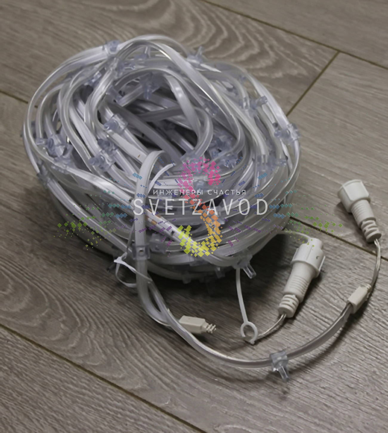 Обратите внимание: Гирлянда поставляется без блока питания, который необходимо приобрести отдельно. Для подключения используются специальные влагозащищенные разъемы. Изделие не подлежит резке и модификации.