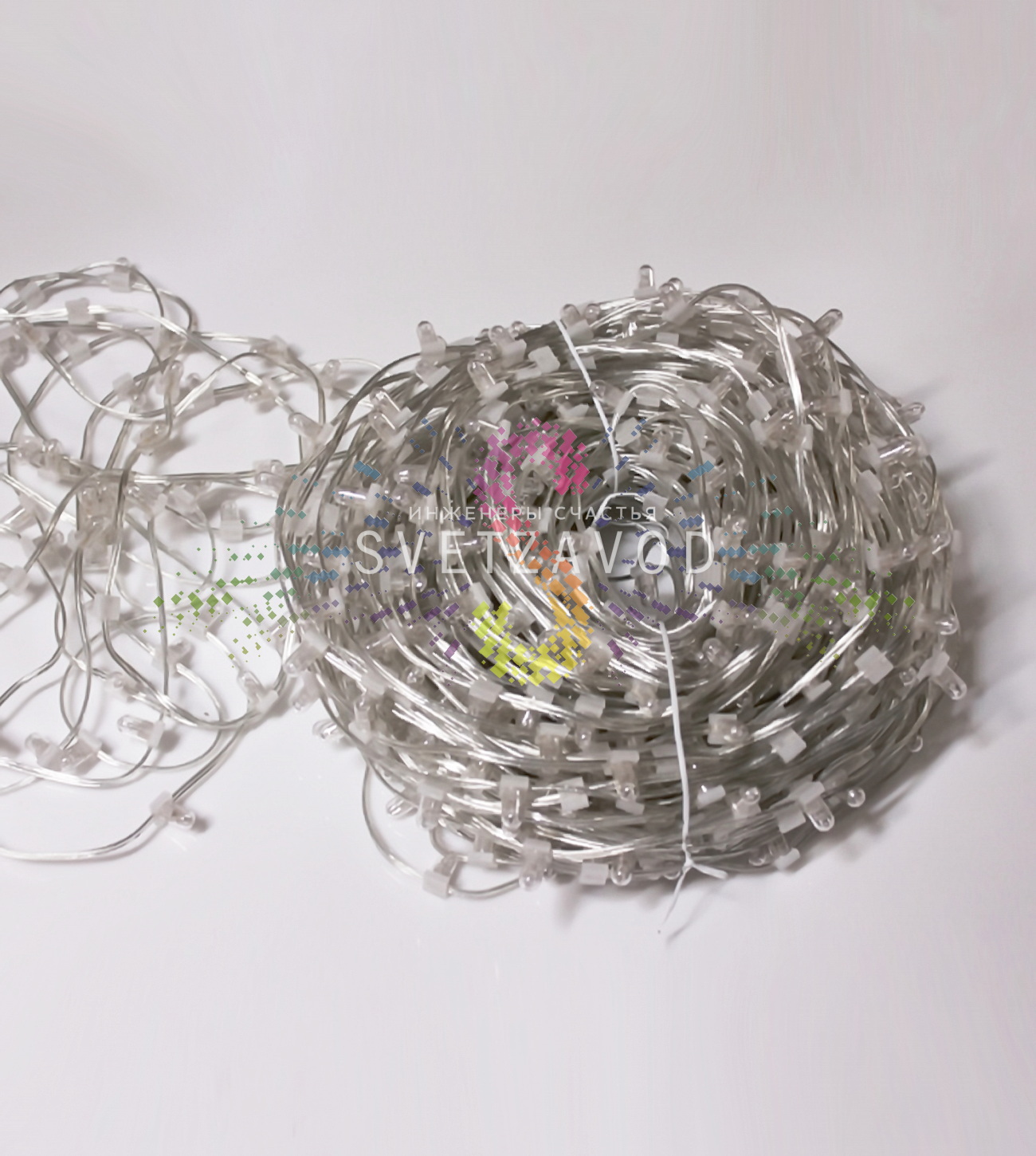 Надежная конструкция: Прозрачный ПВХ-кабель обладает повышенной гибкостью и устойчивостью к УФ-излучению. Каждый светодиод защищен индивидуальным пластиковым колпачком, что предотвращает механические повреждения и обеспечивает равномерное распределение света. Мерцающий режим работы запрограммирован на заводе.