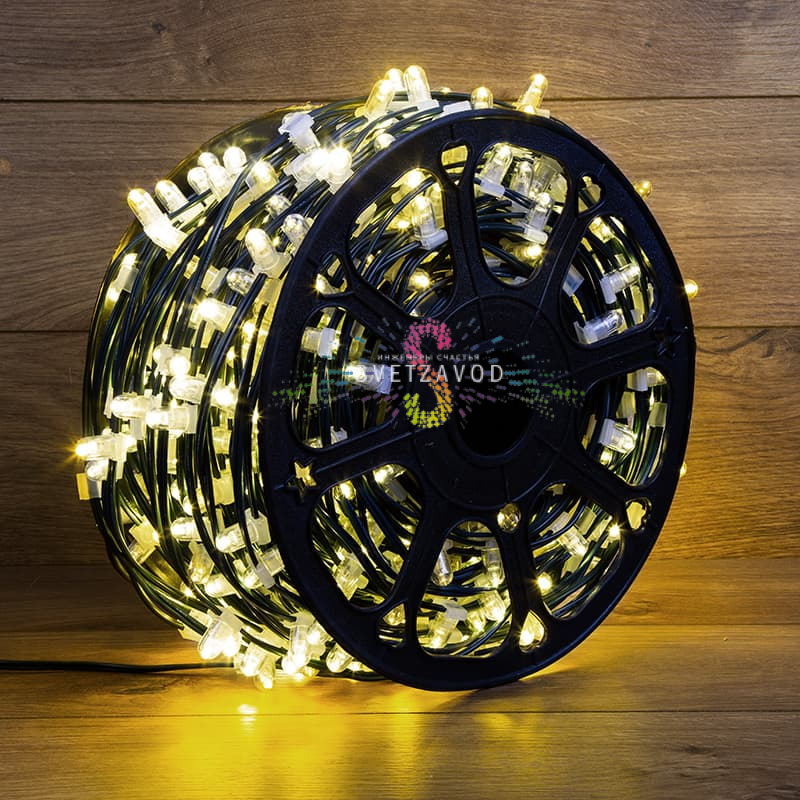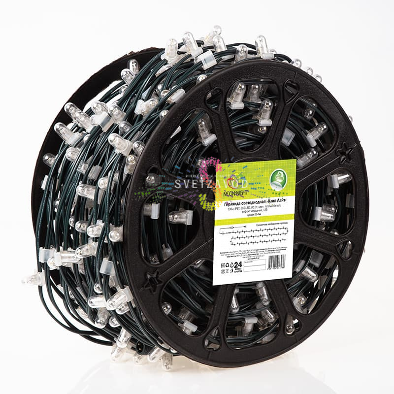 Конструкция для долгой службы: Гирлянда выполнена в прочном черном ПВХ-корпусе, устойчивом к механическим повреждениям, влаге и ультрафиолету. Длина 100 метров позволяет охватить большие площади, а тепло-белое свечение с элементами мерцания создает уютную и праздничную атмосферу.