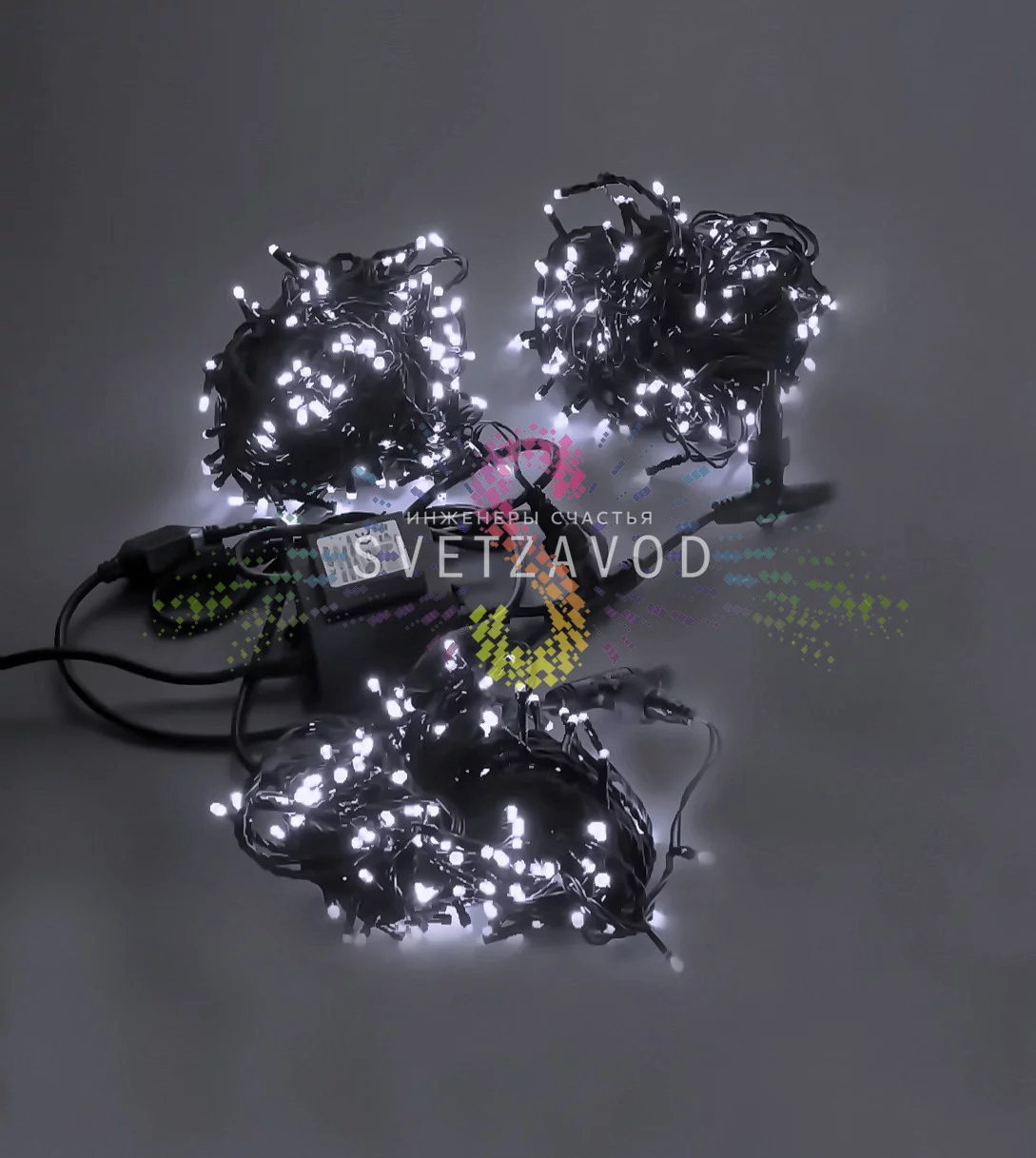 Гирлянда собрана на прочном черном ПВХ-проводе, который малозаметен на фоне коры и веток. Каждый из трех лучей оснащен 200 яркими DIP-светодиодами холодного белого свечения, расположенными с шагом 10 см. Низковольтное питание 24В делает систему абсолютно безопасной для людей и окружающей среды, а также продлевает срок службы светодиодов до 40 000 часов.