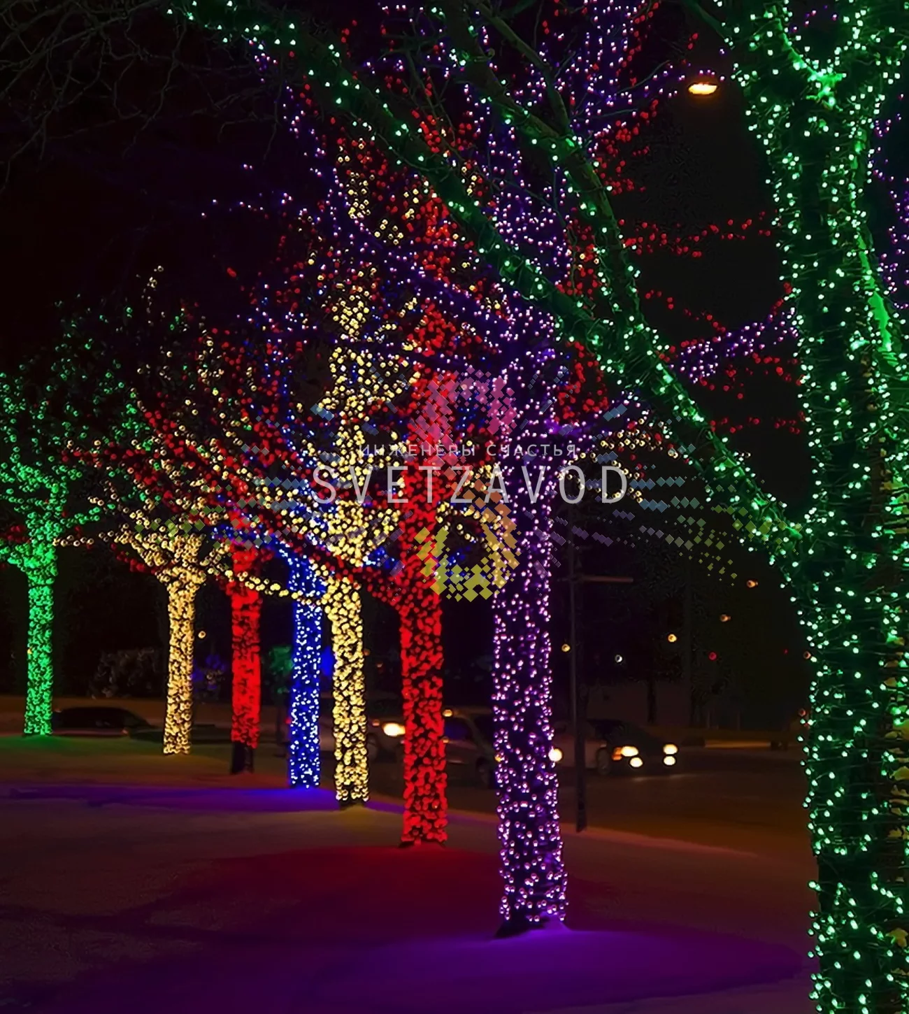 Совет эксперта: Для быстрого и эффектного оформления деревьев с раскидистой кроной, а также создания объёмного сияния — оптимальным выбором станет Спайдер. Данная гирлянда состоит из центрального кольца, от которого радиально расходятся 3 или 5 светодиодных лучей по 20 метров каждый, что позволяет быстро разместить лучи по ветвям без сложного монтажа. Спайдер создаёт объёмный эффект свечения с акцентом в центре композиции, идеально подходит для средних и крупных деревьев, арок и колонн. (Источник: Украшение деревьев новогодними гирляндами: Клип Лайт и Спайдер)